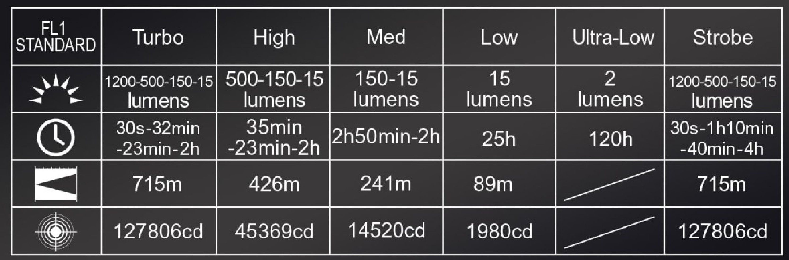 - Turbo: 1200 → 500 → 150 → 15 lm | 715 m – 30 s + 32 min + 23 min + 2 h