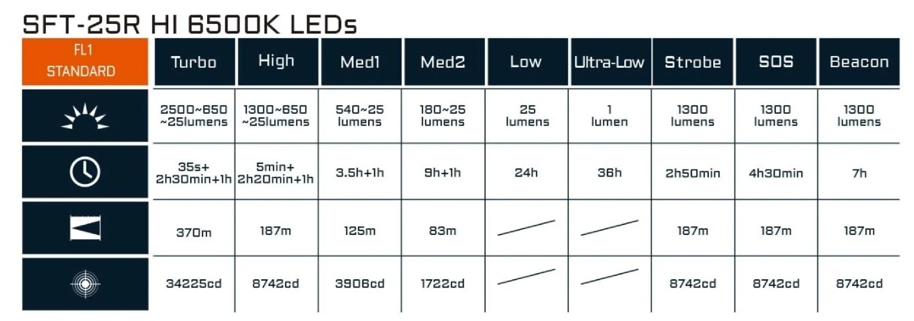 - Turbo: 2500 ~ 650 ~ 25 lumenów, 370 metrów, 35 sekund + 2 godziny 30 minut ~ 1 godzina