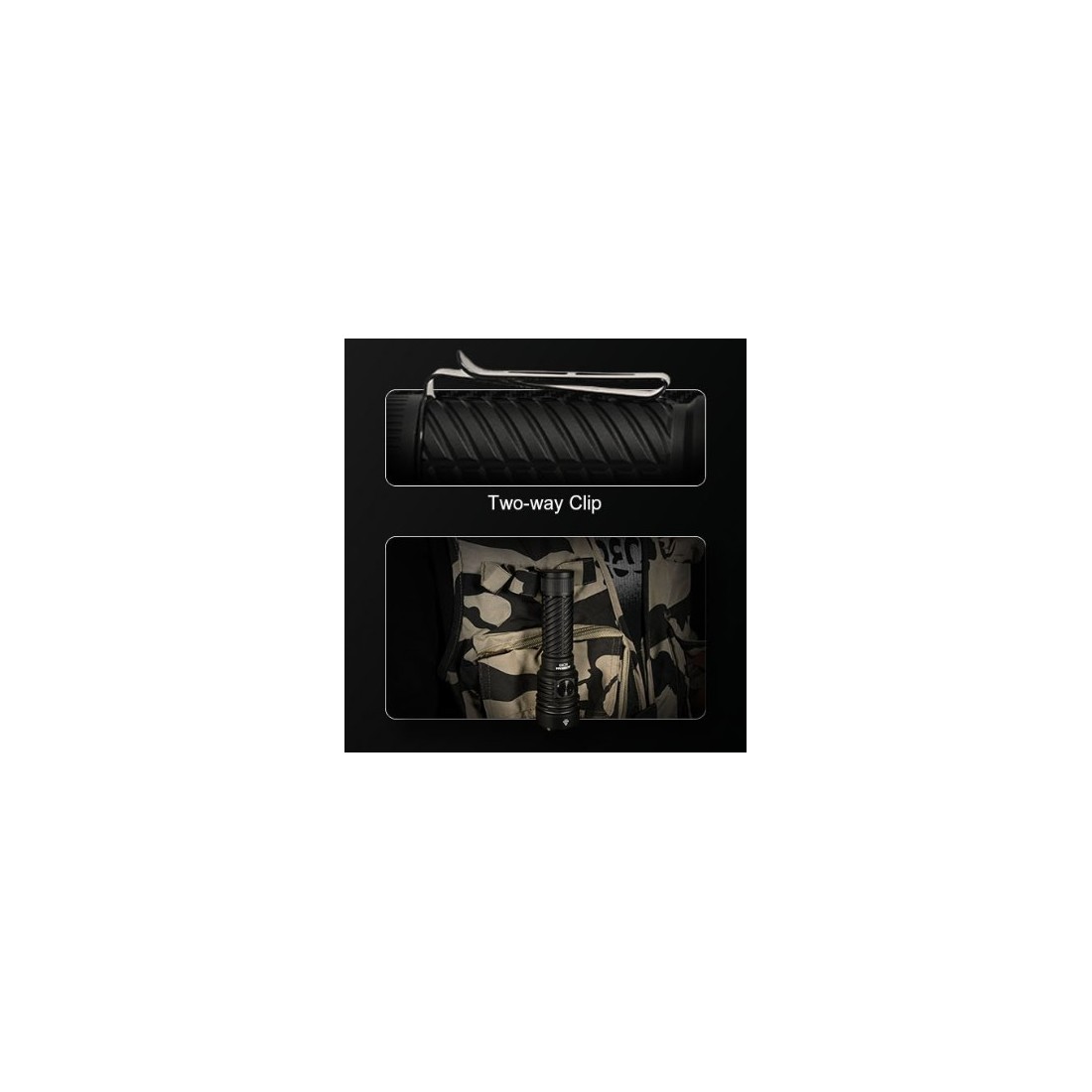 Latarka została wyposażona w boczny włącznik do szybkiej zmiany trybów oraz dwukierunkowy klips, który pozwala na wygodne przypięcie w pozycji pionowej lub poziomej – np. do plecaka, paska lub oporządzenia EDC.