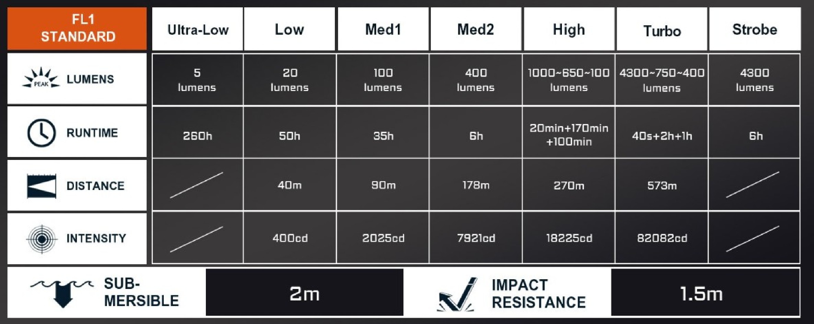- Turbo – 4300 → 750 → 400 lumenów, zasięg 573 metry, czas pracy 40 sekund + 2 godziny + 1 godzina