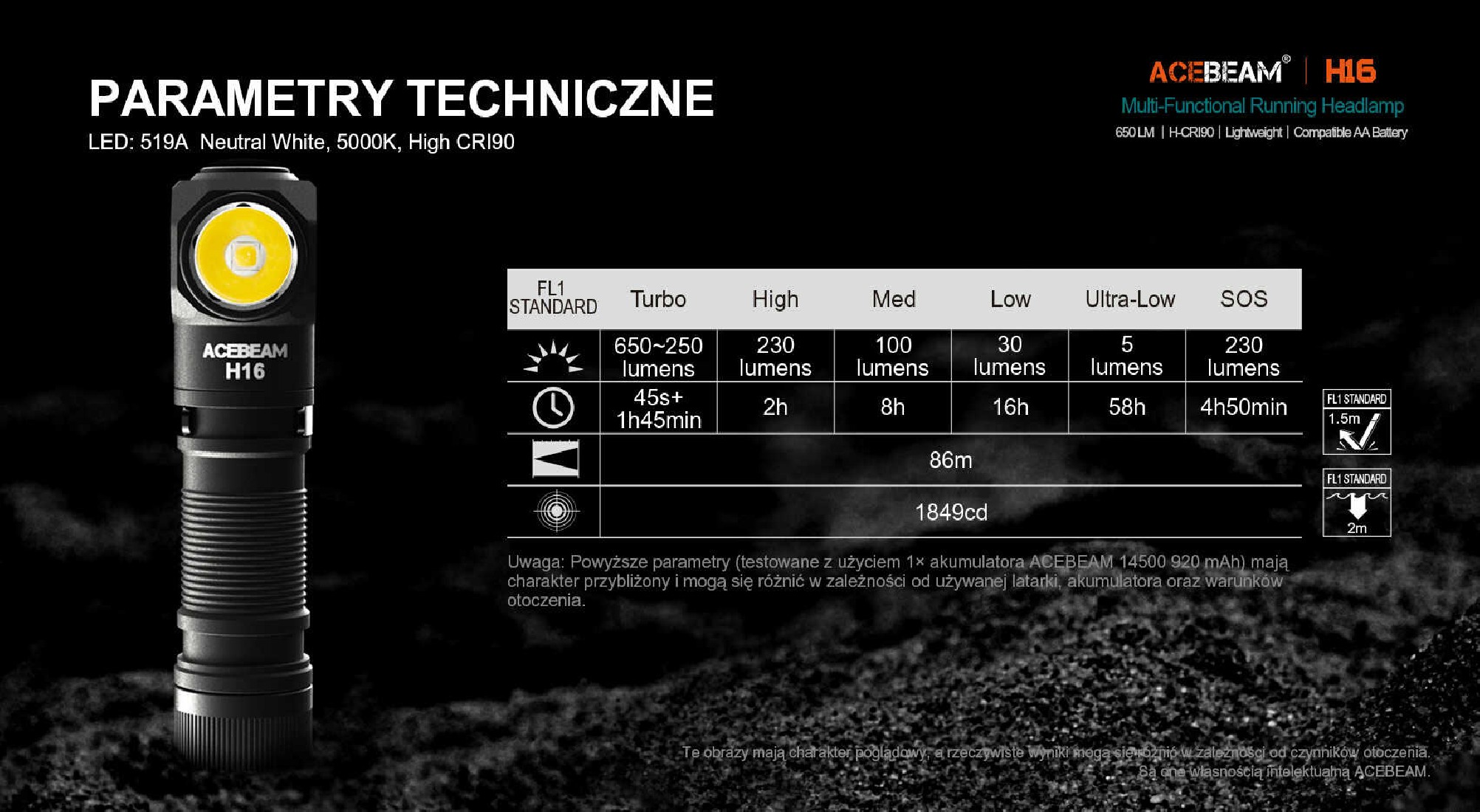 - 6 trybów pracy - Od trybu Turbo po Ultralow, H16 oferuje wiele możliwości dostosowania światła do aktualnych potrzeb, z czasem pracy sięgającym nawet 58 godzin.