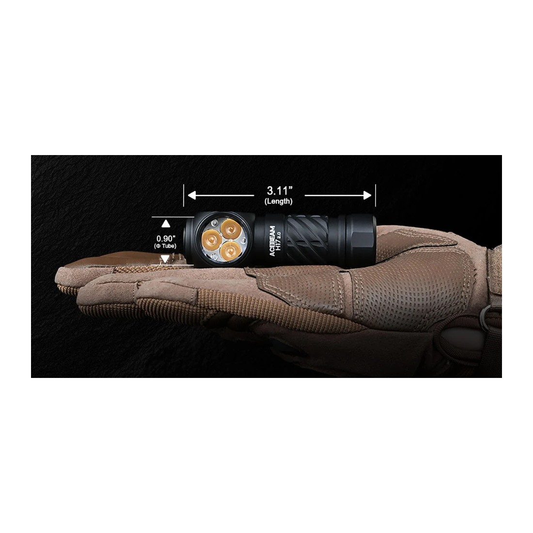 Acebeam H17 2.0 to kompaktowa latarka czołowa o ciepłej białej barwie światła z magnetyczną podstawą, która pewnie mocuje się do metalowych powierzchni. Posiada trzy białe diody LED o temperaturze barwowej 4000K (CRI 90+), zapewniające miękkie i komfortowe oświetlenie z maksymalną mocą 2000 lumenów, docierając do 128 metrów w trybie Turbo. Latarka posiada klips, który ułatwia mocowanie do kurtek, plecaków czy pasków.