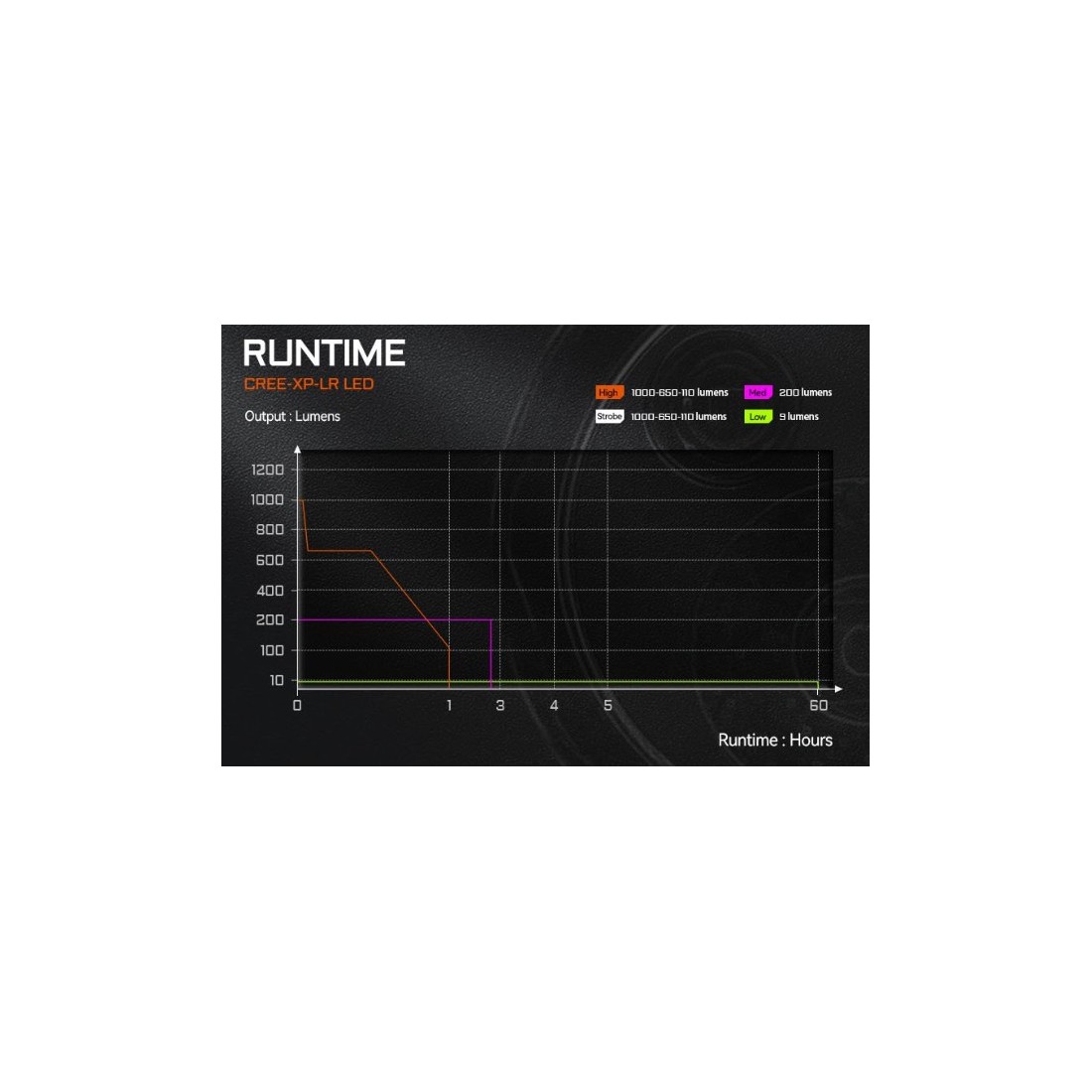Latarka wykorzystuje diodę CREE XP-LR 6500K generującą silny strumień światła z maksymalnym zasięgiem 223 metrów. Dostępne tryby: