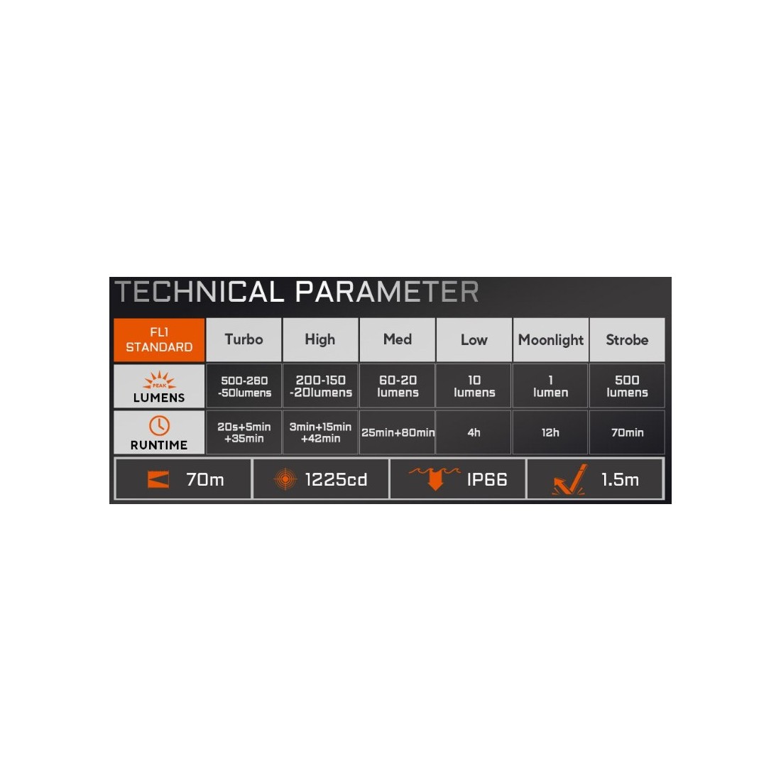 - Turbo: 500~260~50 lumenów, zasięg do 70 m, czas pracy 20 s ~ 35 min