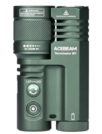 Latarka AceBeam Terminator M1 wyposażona w system Dual LEP & LED wykorzystuje zarówno technologię LEP (Laser Excited Phosphor), jak i LED (Nichia 519A Floodlight 5000K High CRI90), oferując użytkownikom wyjątkowe możliwości oświetleniowe.