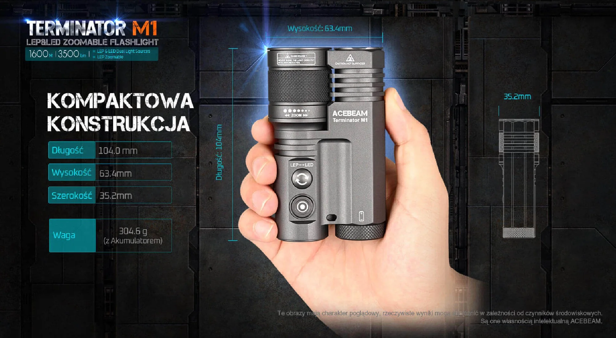 Terminator M1 to przełomowy produkt firmy Acebeam, łączący w sobie najnowszy LEP z technologią LED. Moduł LEP wytwarza wiązkę światła na imponującą odległość do 1600 metrów. AceBeam Terminator M1 to idealne rozwiązanie dla szerokiego spektrum użytkowników - od profesjonalistów, takich jak służby ratunkowe i wojsko, po entuzjastów outdoorowych aktywności, takich jak wspinaczka, biwakowanie czy wędkarstwo. Kompaktowy rozmiar i lekkość sprawiają, że latarka jest łatwa do przenoszenia i niezastąpiona podczas podróży oraz wypraw.