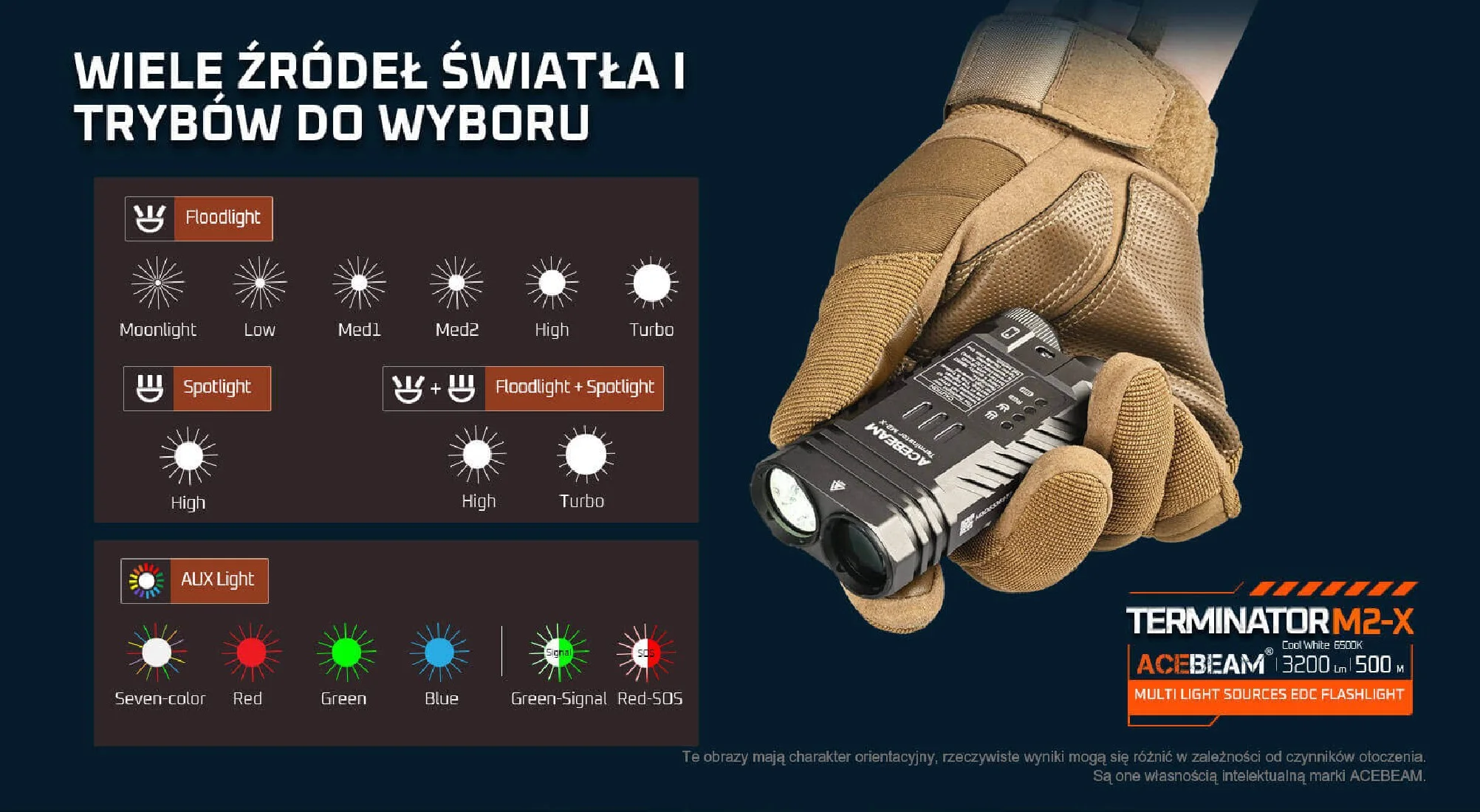 Latarka AceBeam Terminator M2-X została wyposażona w zaawansowany system źródeł światła.