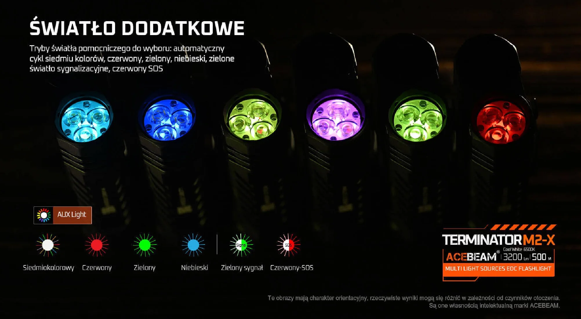 Dioda AUX Light w AceBeam Terminator M2-X, choć mniej rzucająca się w oczy niż główne źródła światła, jest niezastąpionym elementem wszechstronnego systemu oświetleniowego tego modelu, oferując: automatyczny cykl siedmiu kolorów,