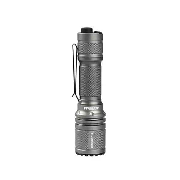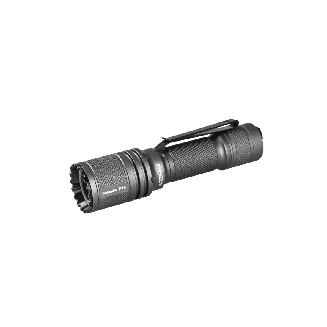 ACEBEAM Defender P16 to kompaktowa latarka taktyczna 1800 lm z zasięgiem do 484 m. Podwójny tylny włącznik daje szybki dostęp do 4 poziomów i Strobe. Zasilanie akumulatorem 18650 3300 mAh z USB-C w zestawie. Wytrzymała konstrukcja AL6061-T6, odporność IP68 i upadki z 1,5 m. Idealna dla służb, ratowników, strzelców, do EDC i outdooru.