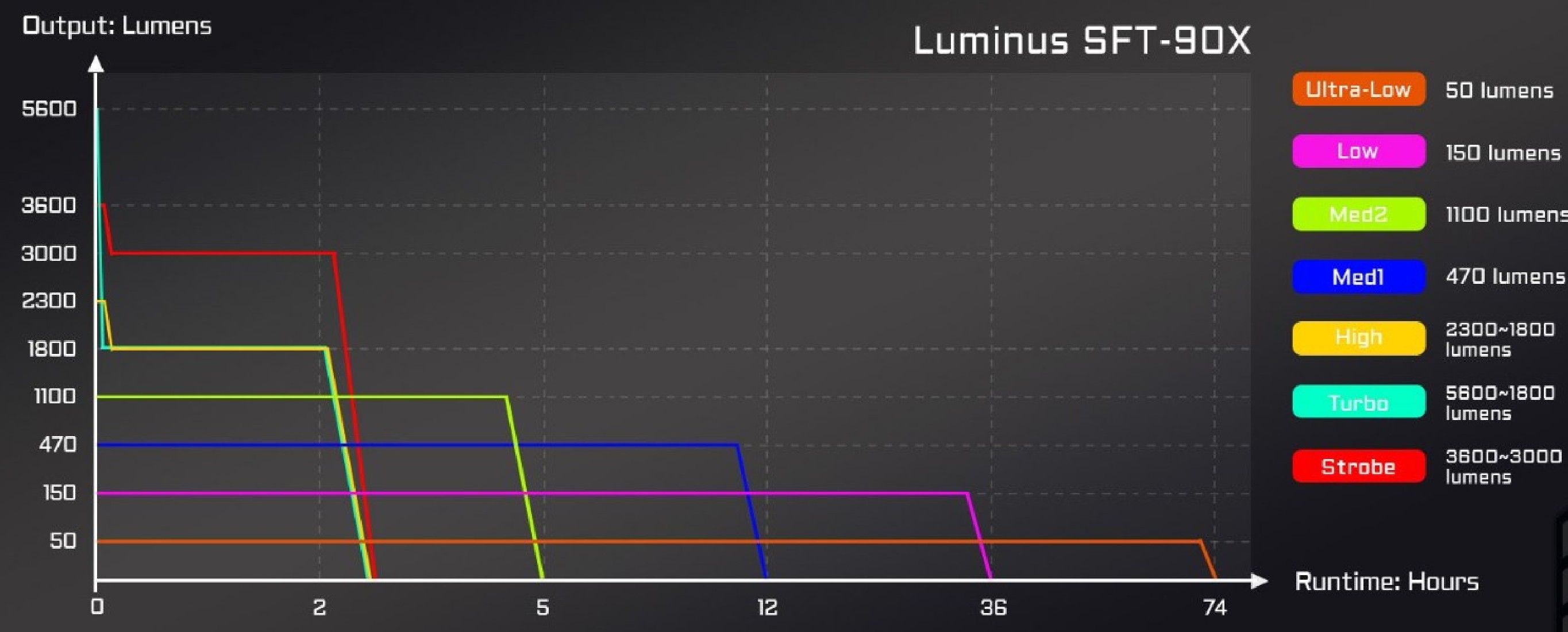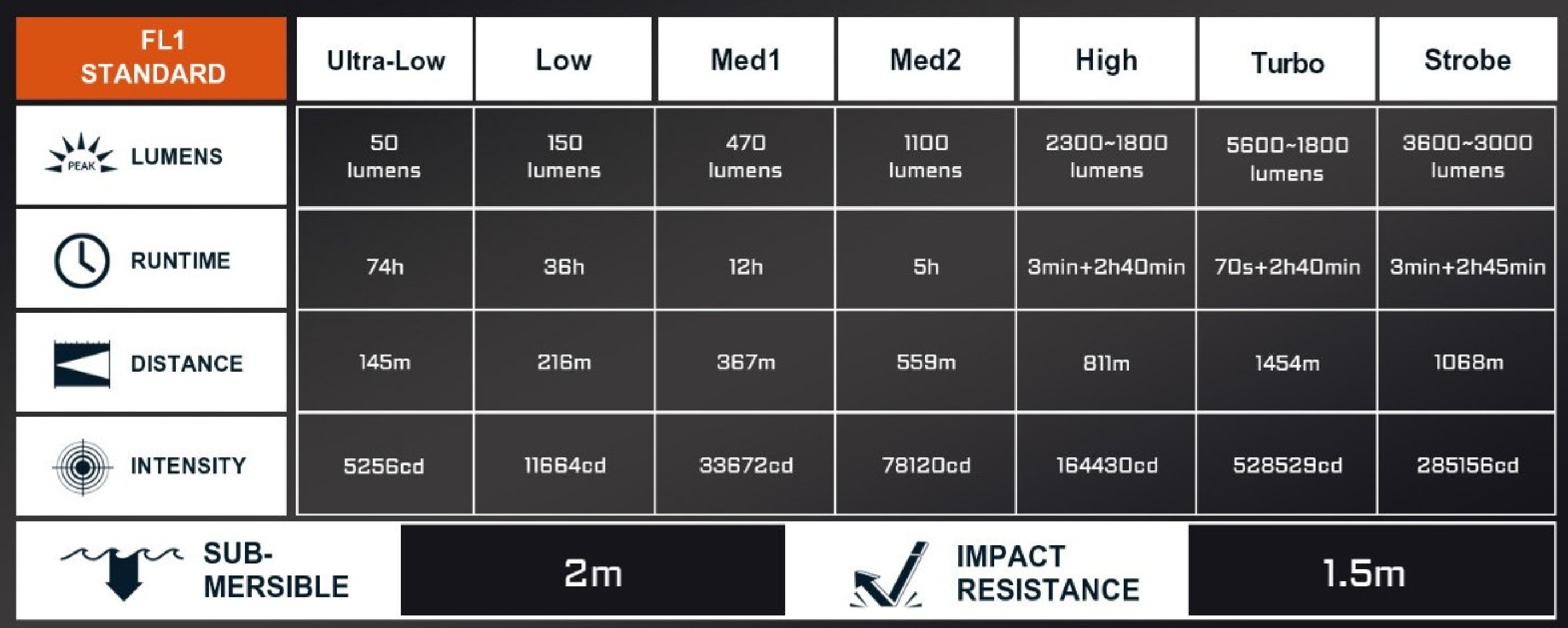- Turbo: 5600 → 1800 lumenów, 1454 metry zasięgu, 70 sekund + 2 godziny 40 minut