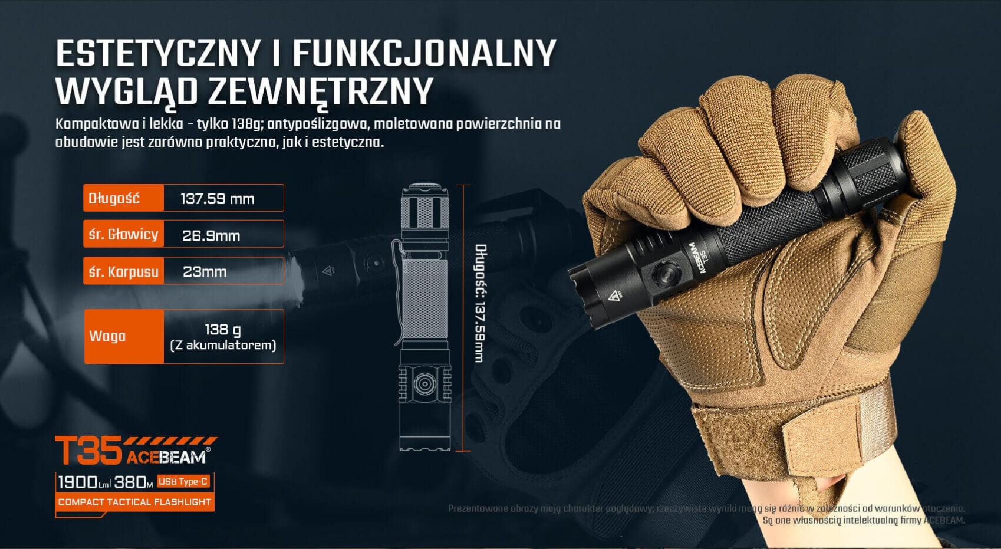 AceBeam T35 to latarka, która łączy w sobie siłę światła z zaawansowaną technologią, oferując użytkownikom niezawodność i funkcjonalność w kompaktowej formie. Doskonała dla entuzjastów outdooru, służb mundurowych, ekip ratowniczych, jak i profesjonalistów potrzebujących dobrego źródła światła.