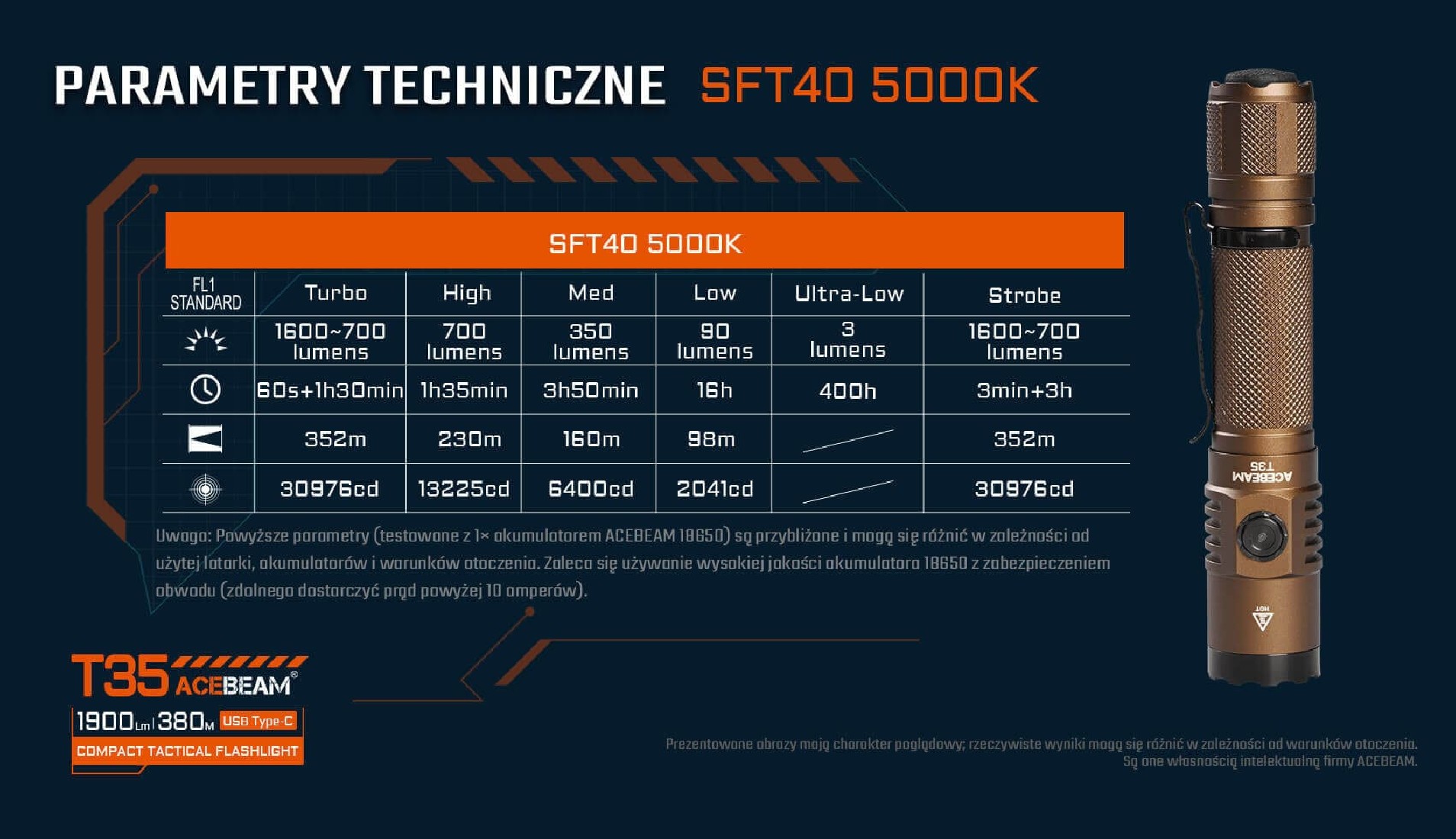 Wyposażona w diodę LED CREE XHP35, latarka AceBeam T35 generuje strumień światła do 1600 lumenów, oświetlając obiekty na maksymalną odległość do 380 metrów.