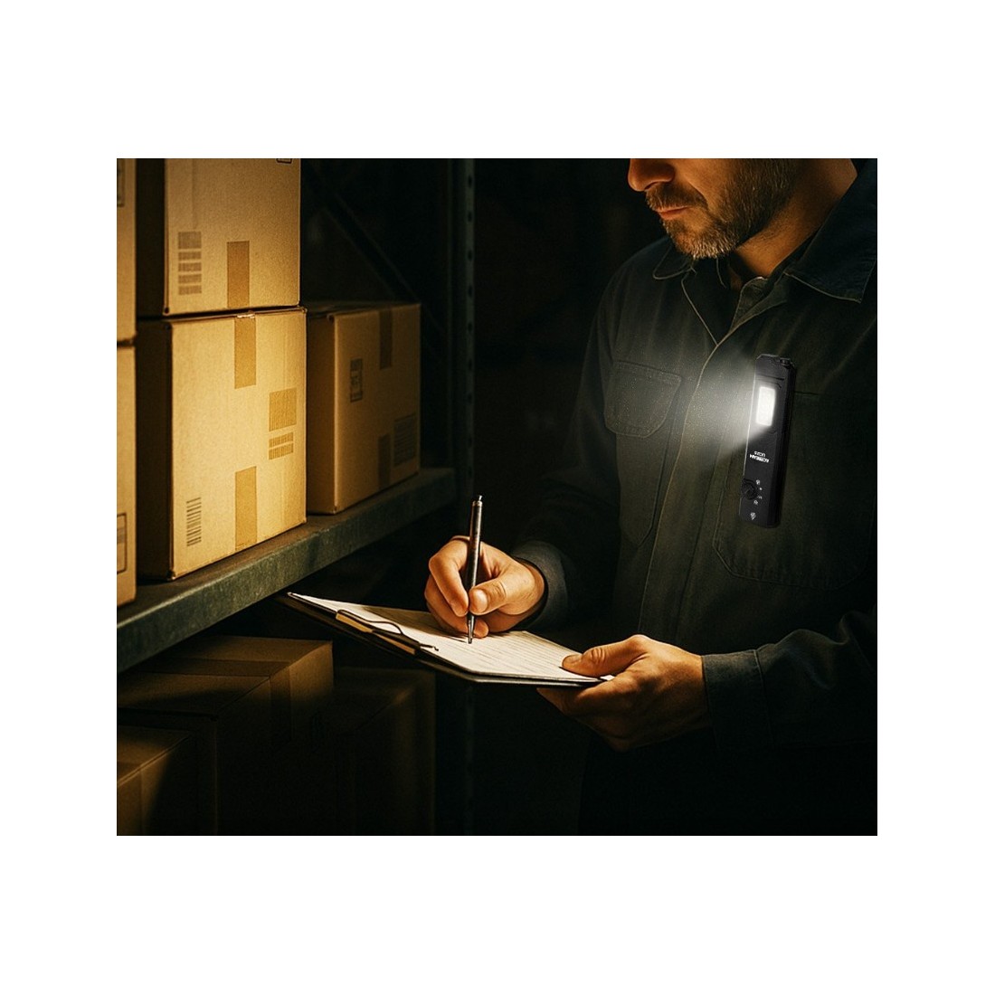 Dolna część latarki wyposażona jest w silny magnes neodymowy, który umożliwia stabilne przymocowanie do metalowych powierzchni – np. karoserii samochodu, rusztowania, drzwi, narzędzi czy konstrukcji stalowych. Dzięki temu latarka może pełnić rolę roboczego oświetlenia warsztatowego lub inspekcyjnego, pozwalając na pracę bez konieczności trzymania jej w dłoni.