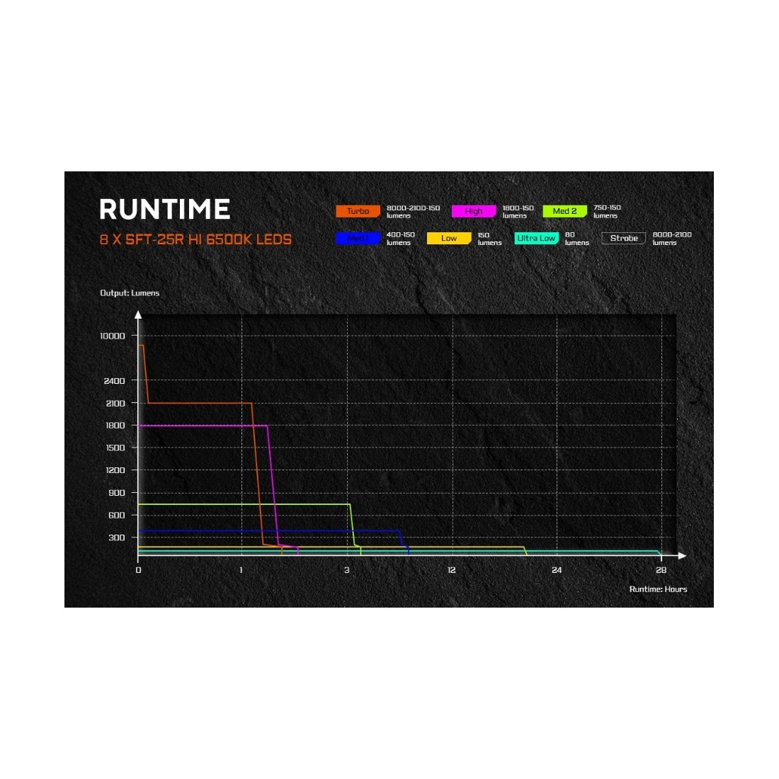Sercem latarki jest zespół ośmiu wysokowydajnych diod LED SFT-25R HI LEDs które generują maksymalnie 8000 lumenów i osiągają imponujący zasięg wiązki do 645 metrów. Dioda ta skupia się na maksymalnym zasięgu i penetracji ciemności.