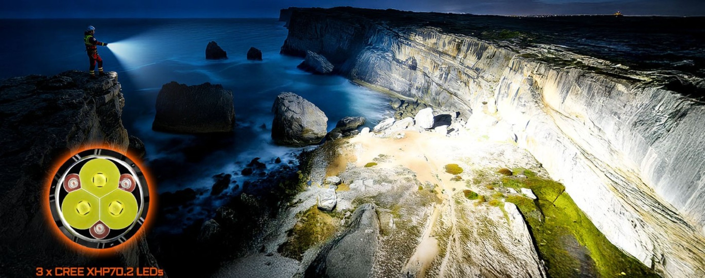 Latarka została wyposażona w trzy wydajne diody CREE XHP70.2 o chłodnej barwie 6500K. Zapewniają one: