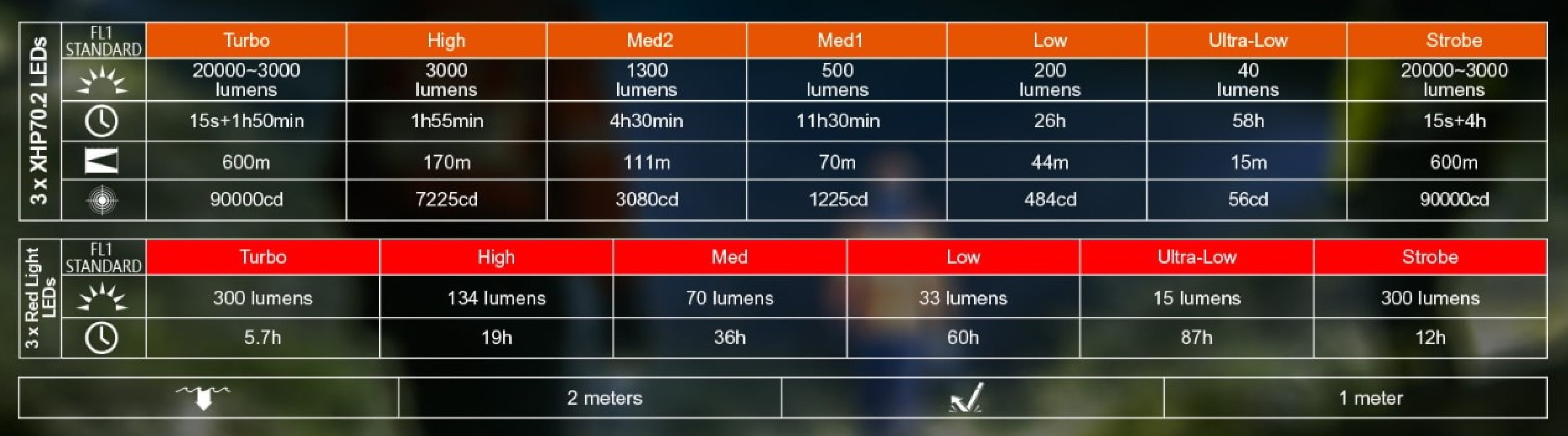 - Turbo: 20 000–3000 lumenów; 90 000 cd; 600 metrów; 15 sekund – 1 godzina 50 minut