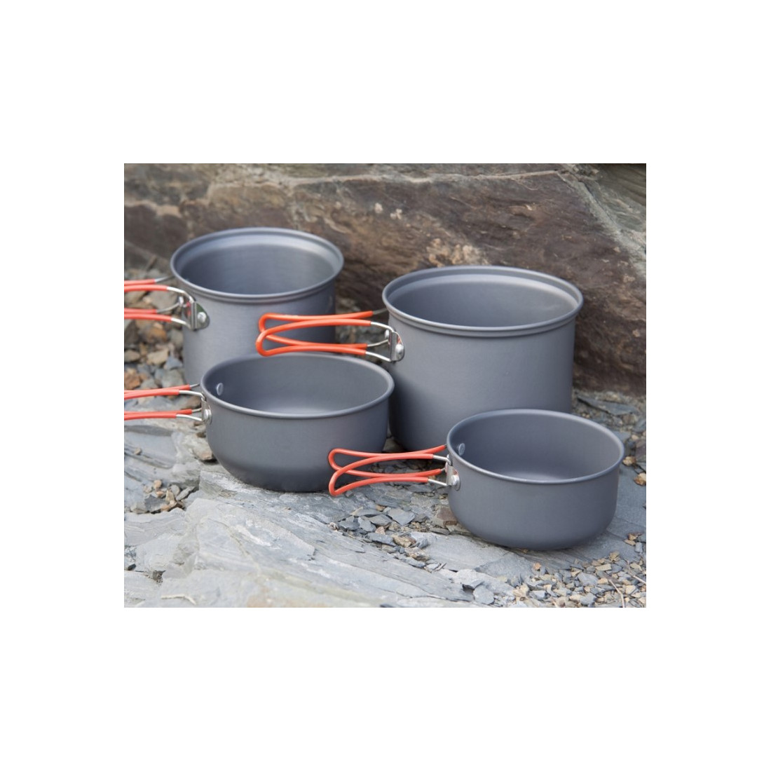 Komplet składa się z 4 naczyń, z krótych dwa mniejsze posłużą podczas gotowania jako przykrywki dla większych. Wszystkie naczynia wykonane są z niezwykle odpornego na uszkodzenia, anodyzowanego aluminium.