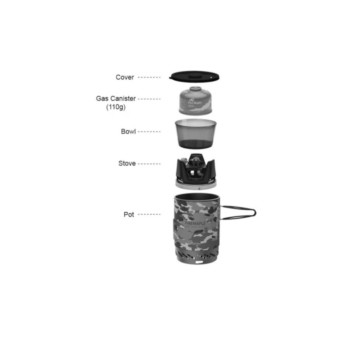 - Kompletny zestaw: palnik z zapalnikiem piezoelektrycznym, garnek 1 L z radiatorem i pokrywką oraz miseczka z tworzywa sztucznego.