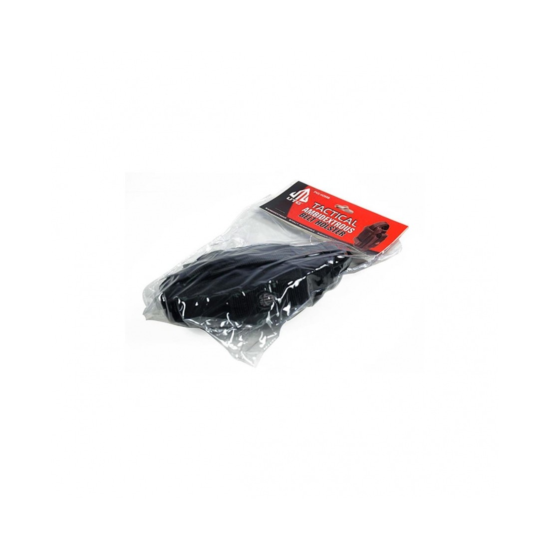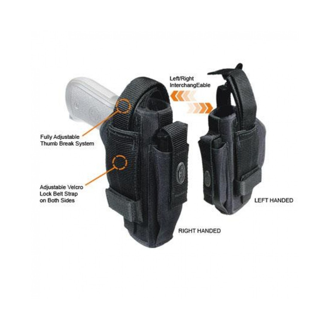Kaburę wykonano z wytrzymałego poliestru, odpornego na przetarcia, wilgoć oraz warunki atmosferyczne. Dzięki otwartej konstrukcji kabura umożliwia przenoszenie wielu rodzajów broni nawet z 6" lufą. Przed wypadnięciem broni zapobiega regulowana blokada velcro, odbezpieczana kciukiem. Grube nylonowe ścianki oraz miękkie wnętrze chronią przed zarysowaniem pistoletu. Obustronna konstrukcja umożliwia mocowanie jej po prawej lub lewej stronie pasa.