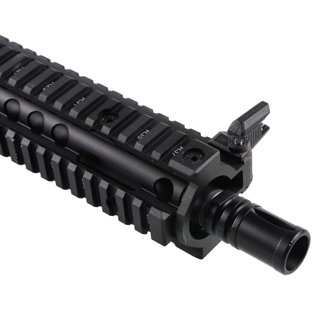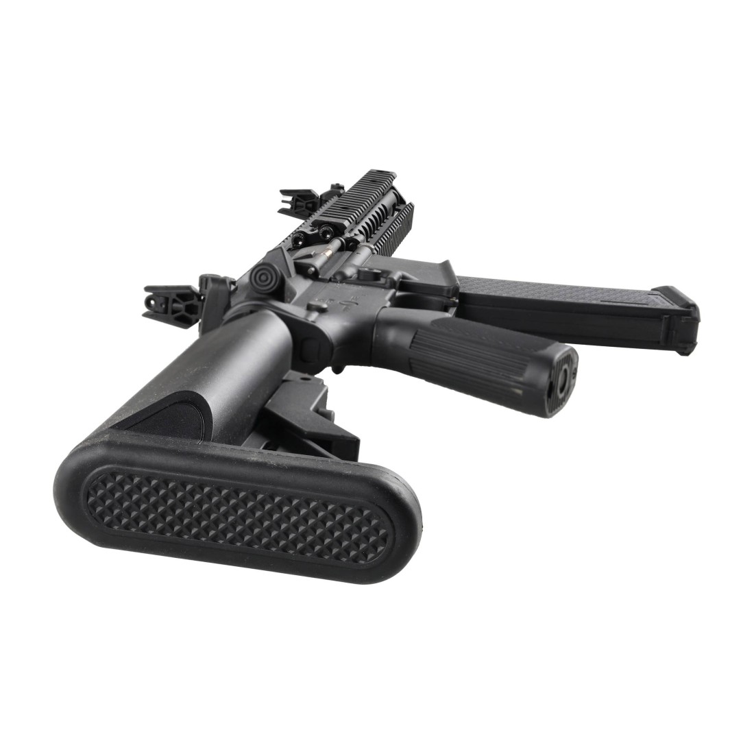 - Materiały: wzmacniany nylonem polimer (korpus, kolba SF), metal (lufa, tłumik), stal (śruby, piny, atrapa zamka).