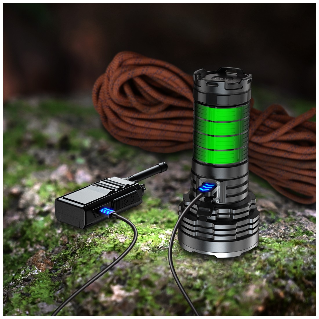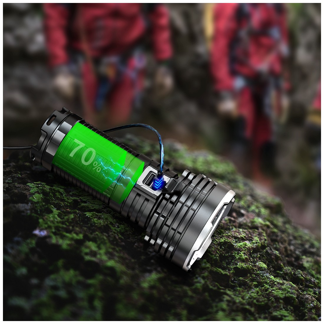 Port USB-C z szybkim ładowaniem (QC 2.0) pozwala na pełne naładowanie w około 4 godziny. Latarka może również działać jako powerbank, umożliwiając ładowanie innych urządzeń.