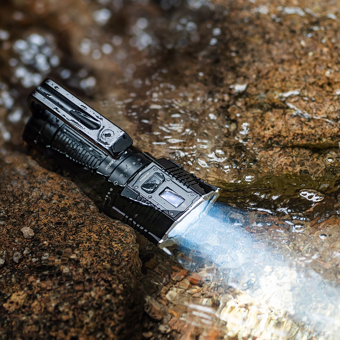 Solidny aluminiowy korpus z głębokim frezowaniem poprawia chwyt i skutecznie odprowadza ciepło generowane przez diody LED. Norma IP68 gwarantuje pełną odporność na kurz, pył oraz zanurzenie w wodzie do 2 metrów przez 30 minut, co zapewnia niezawodność nawet w najbardziej wymagającym terenie.
