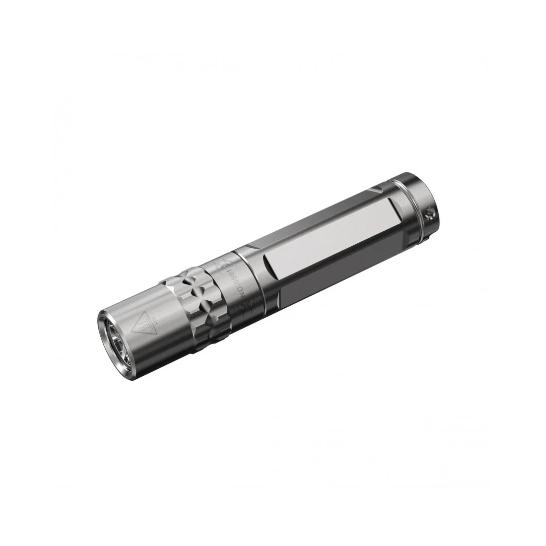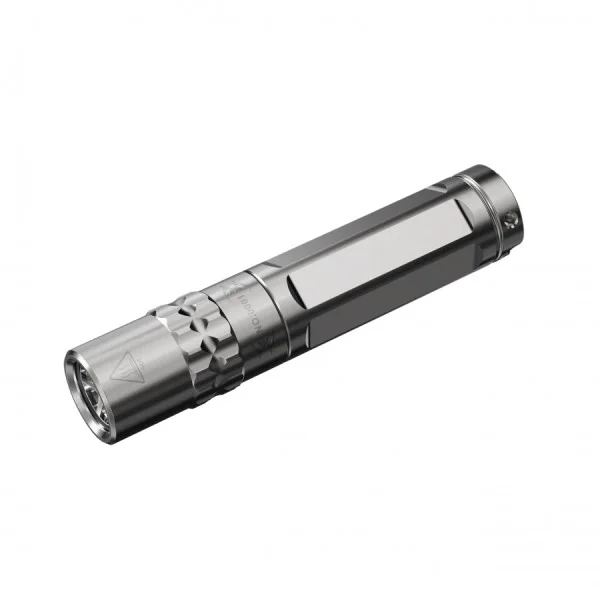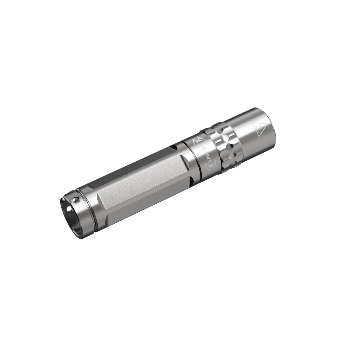 Tubus miniaturowej latarki wykonano z trwałej stali nierdzewnej, którą poddano precyzyjnej obróbce CNC. Latarka o długości 70,8 mm, z baterią AAA waży zaledwie 51,5 g, dlatego może nam zawsze towarzyszyć w codziennej pracy, podczas wycieczki i innej aktywności outdoorowej. Wystarczy przypiąć latarkę do kluczy, plecaka lub torby biodrowej, by w razie potrzeby rozświetlić mrok potężnym strumieniem światła.