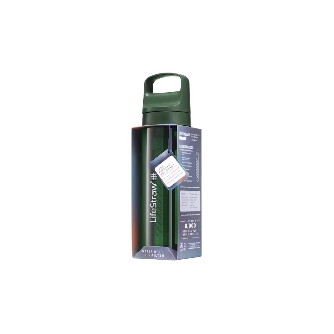 - Zestaw zawiera: butelkę LifeStraw Go Series, filtr membranowy, filtr węglowy, zakrętkę z ustnikiem silikonowym, instrukcję użytkownika, oryginalne opakowanie