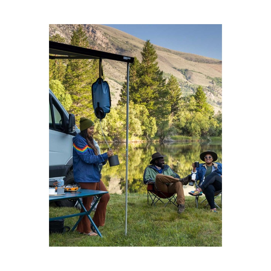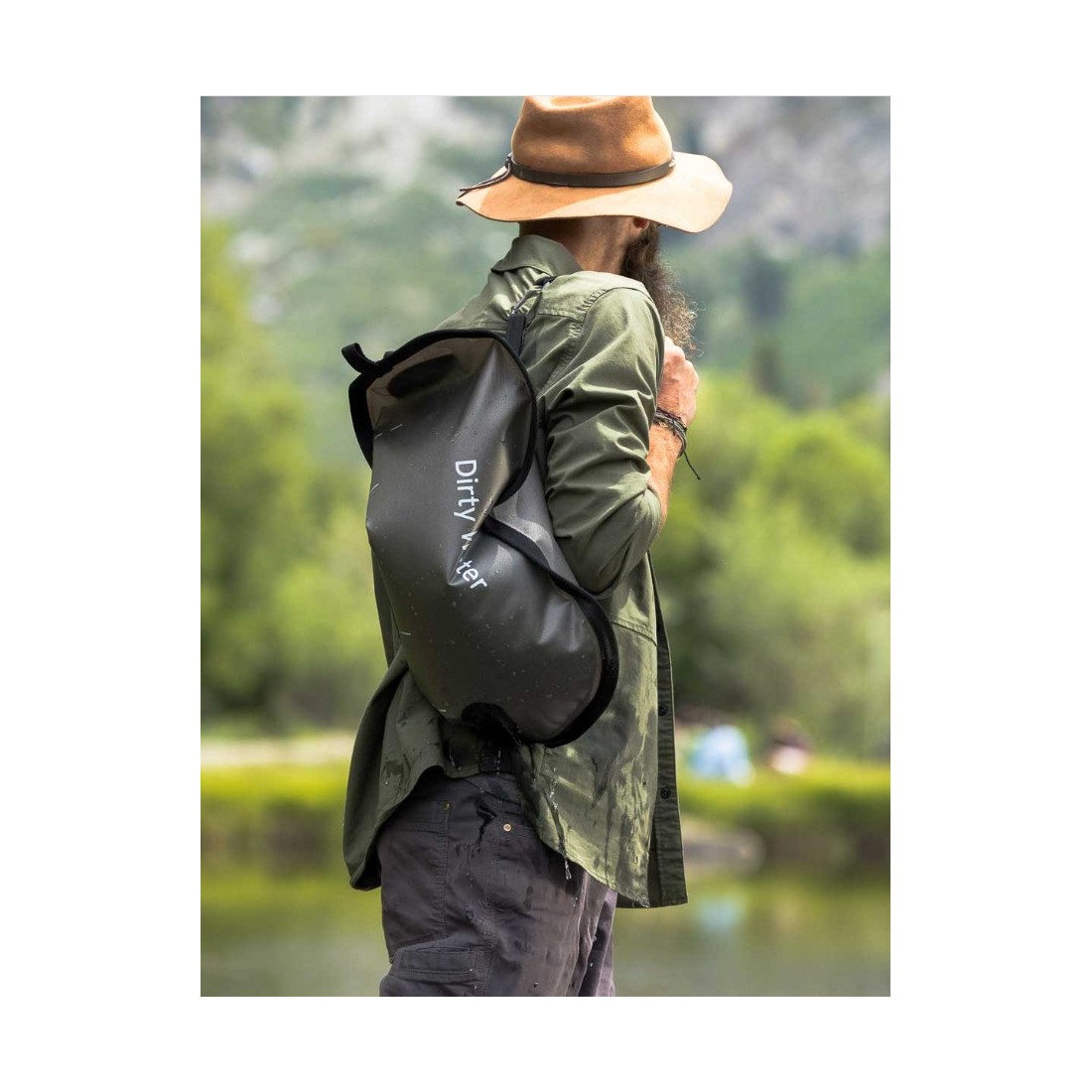 System grawitacyjny umożliwia łatwe zawieszenie worka na drzewie, konstrukcji lub pojeździe, zapewniając szybki dostęp do czystej wody bez potrzeby pompowania.