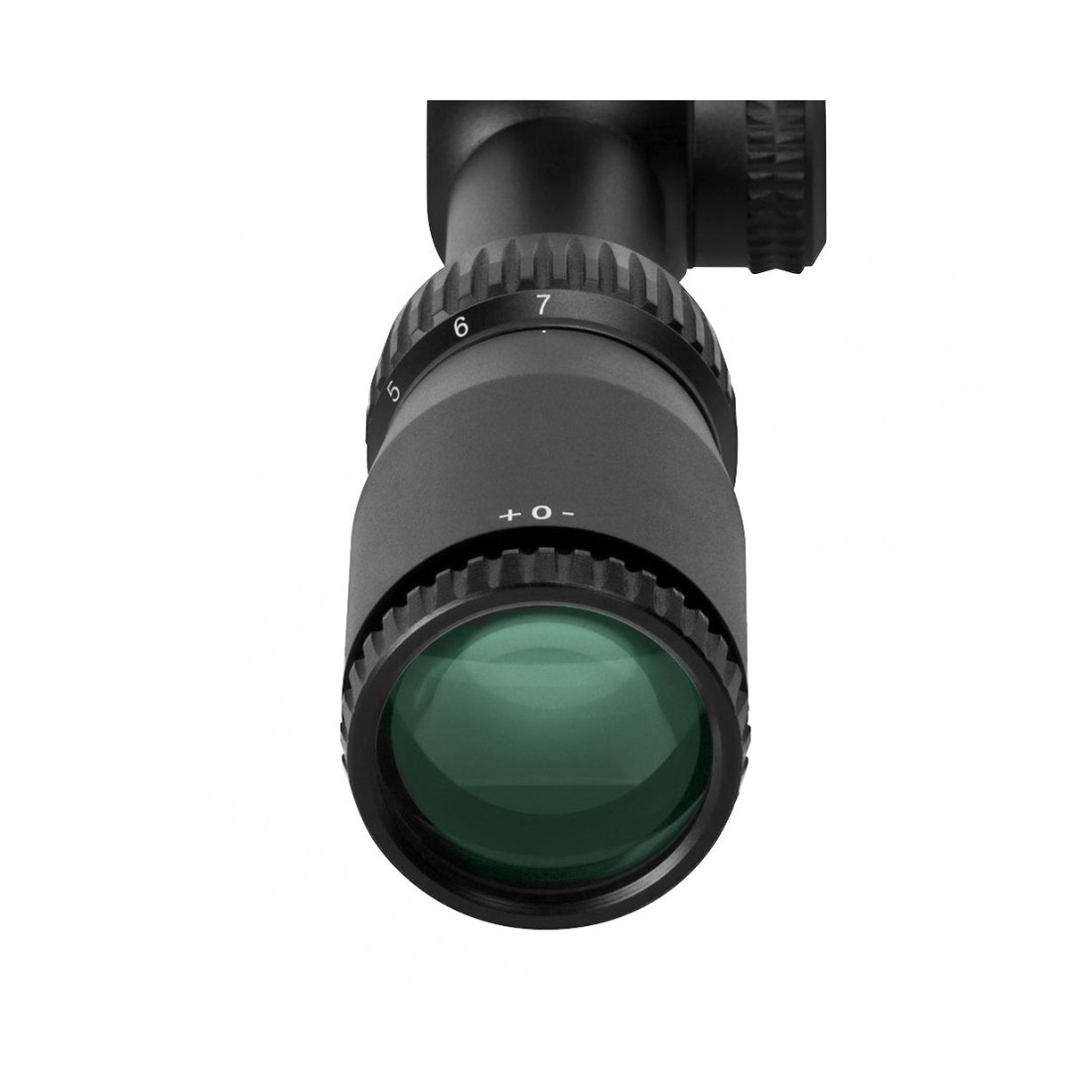 Calowy tubus pozwala na bardzo duży zakres regulacji siatki celowniczej w zakres 60 MOA w pionie i poziomie. Paralaksa jest fabrycznie ustawiona na 45 m. Jeden klik zmienia ustawienia o 1/4 MOA, pełny obrót bębna przesuwa krzyż o 15 MOA.