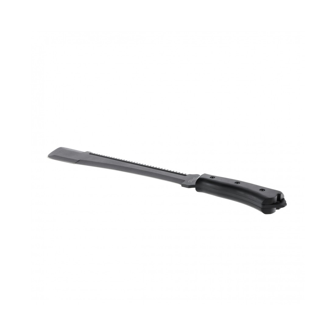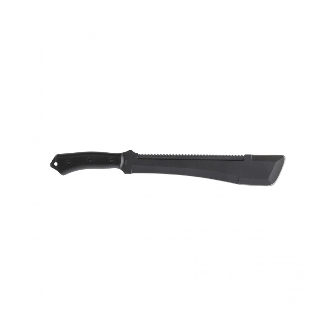 Głownia została wykonana z wytrzymałej stali węglowej 1065, która cechuje się dużą odpornością na wyszczerbienia i uszkodzenia mechaniczne. Poszerzona część przy sztychu zwiększa siłę uderzenia, co czyni maczetę wyjątkowo skuteczną podczas rąbania grubszych gałęzi. Łukowata krawędź tnąca pozwala natomiast wygodnie korować drewno, a dwurzędowa piła na grzbiecie umożliwia sprawne przecinanie większych kawałków drewna bez potrzeby sięgania po dodatkowe narzędzia.