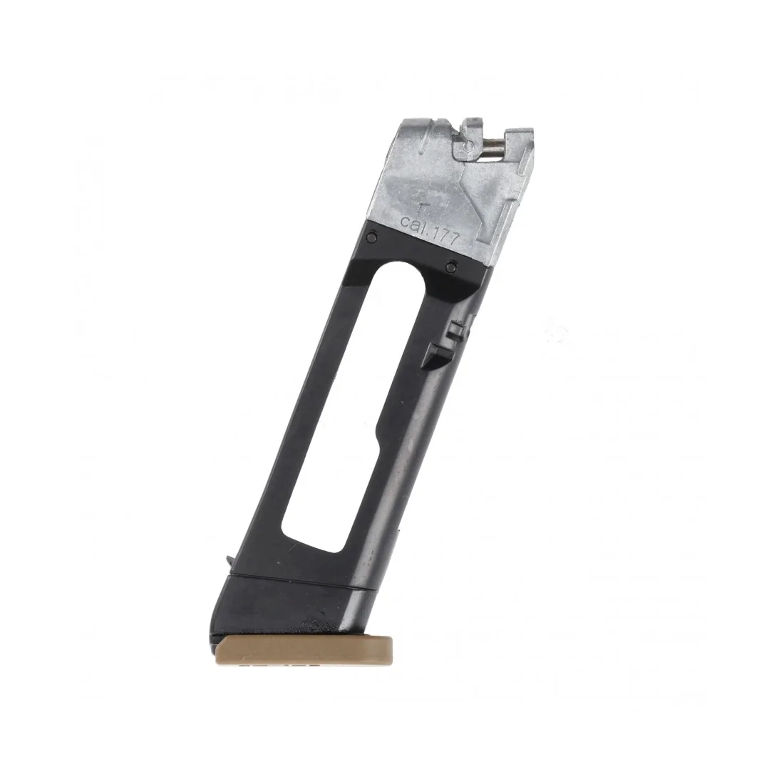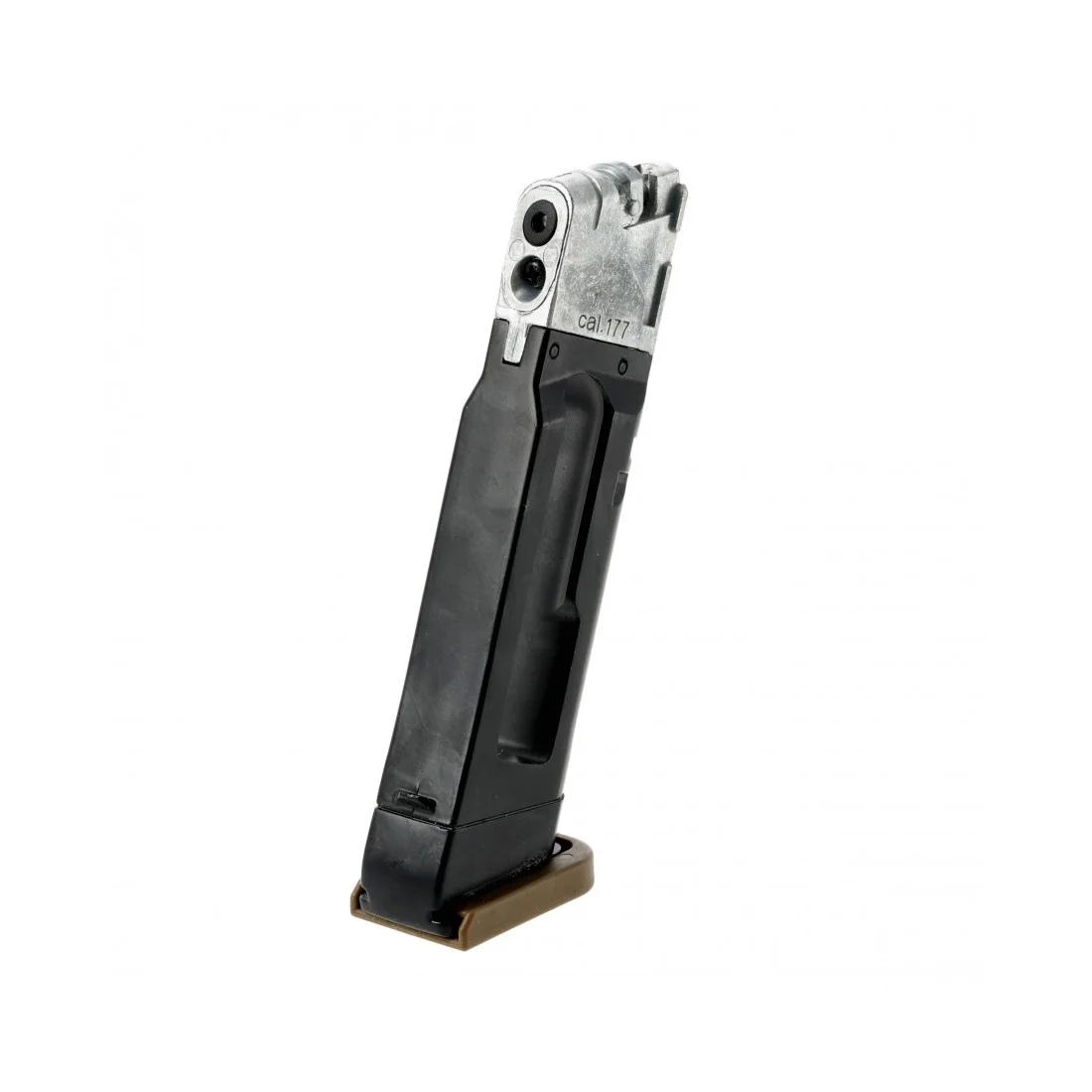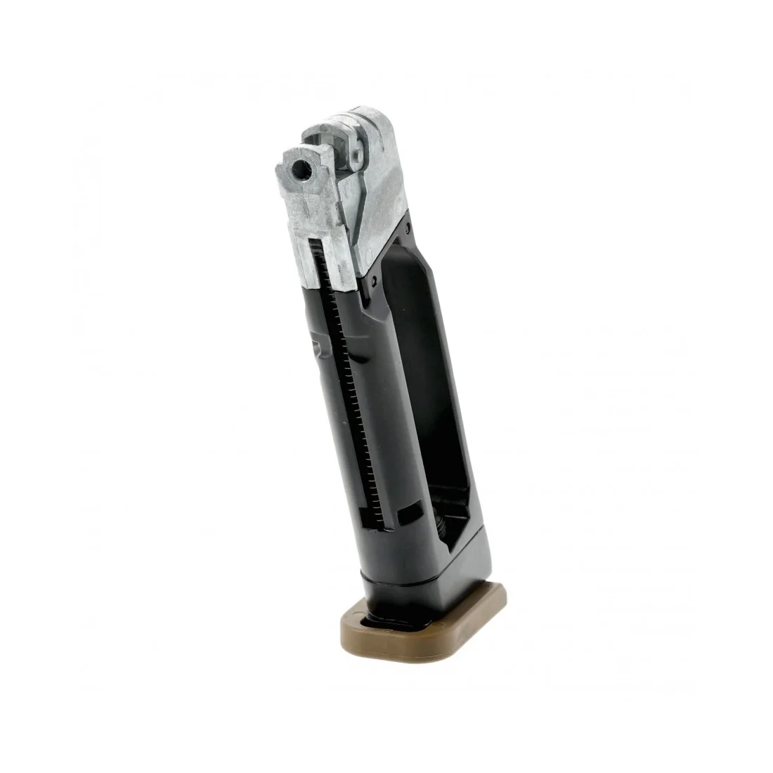 Zapasowy magazynek na 18 śrutów BB's, dedykowany do pistoletu wiatrówki Glock G19X blowback BB 4,5 mm. Korpus magazynka jest metalowy, z polimeru wykonano stopkę oraz blokowany podajnik kulek. Wewnątrz magazynka znajduje się przedział na kapsułę CO2.
