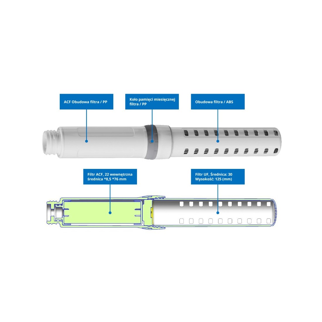 - System filtrujący: wymienny filtr z aktywowanym węglem i membraną UF (0.1 mikrona).