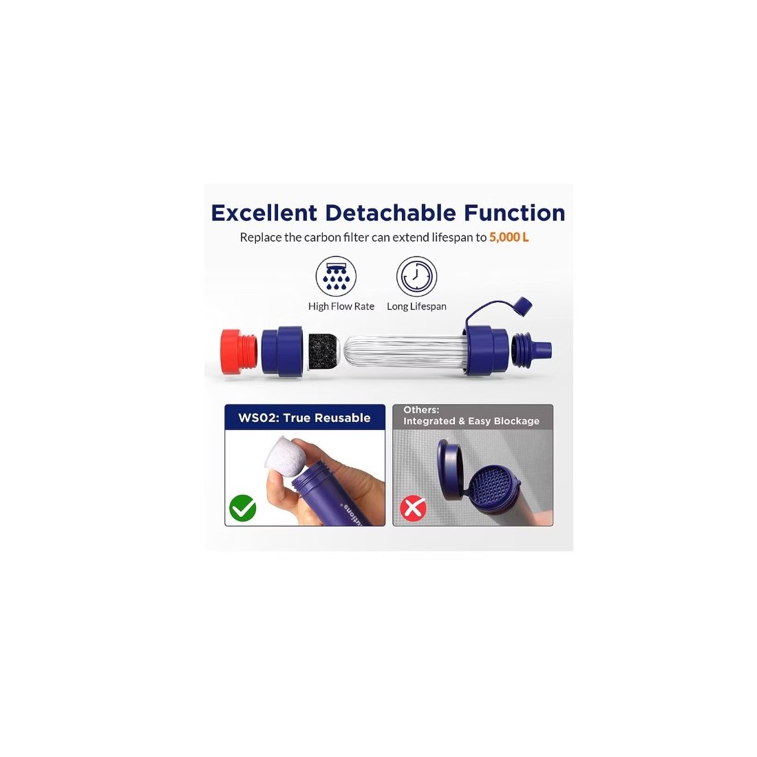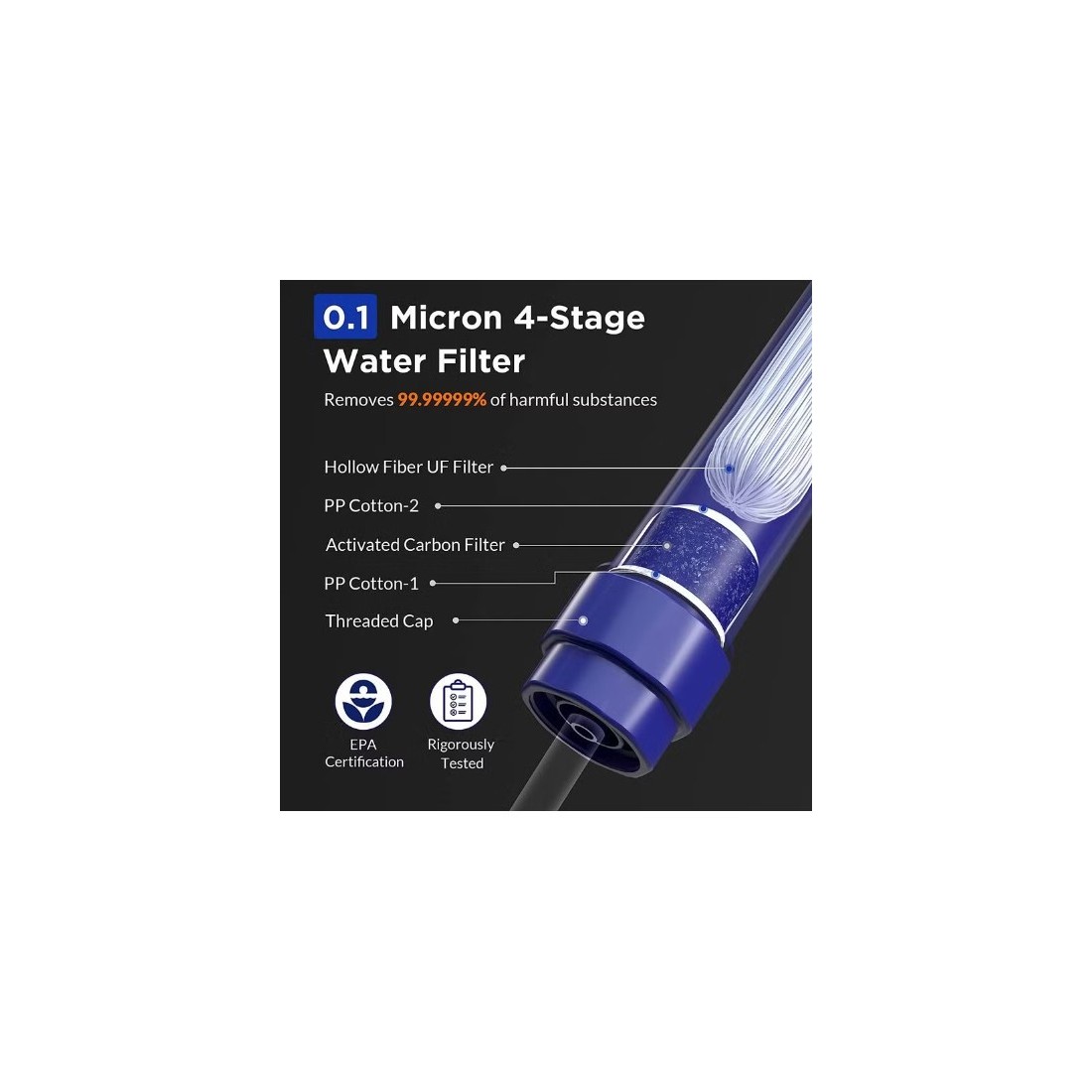 - Wydajność filtracyjna: do 99,99999% eliminacji bakterii, do 99,99% pasożytów, do 99,999% mikroplastiku, separacja zanieczyszczeń stałych.