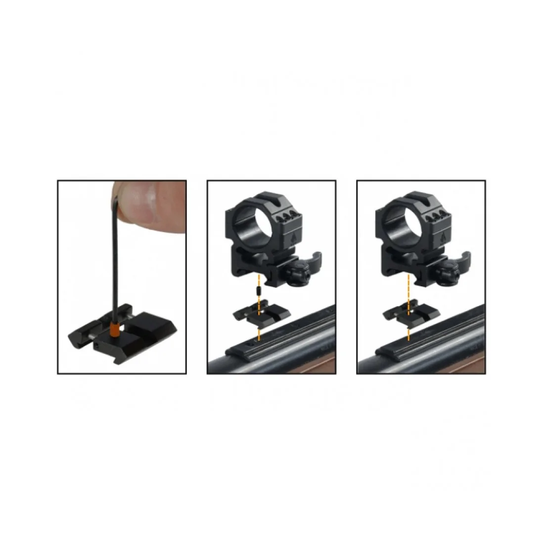 Uwaga! Adapter pasuje wyłącznie do karabinków z płaską pokrywą komory zamka/ tłoka lub posiadających podwyższoną płaską szynę 11 mm. W komplecie znajduje się 1 adapter.