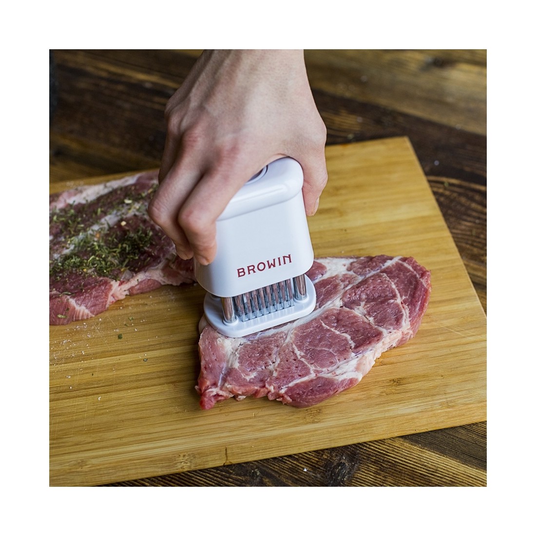 Nakłuwacz do mięsa Browin z zabezpieczeniem to dodatek kuchenny, pozwalający na przygotowanie soczystych steków oraz odpowiednie skruszenie czerwonego mięsa. Model wyposażony w 56 ostrzy ze stali nierdzewnej oraz blokadę chroniącą przed przypadkowym wysunięciem kolców.