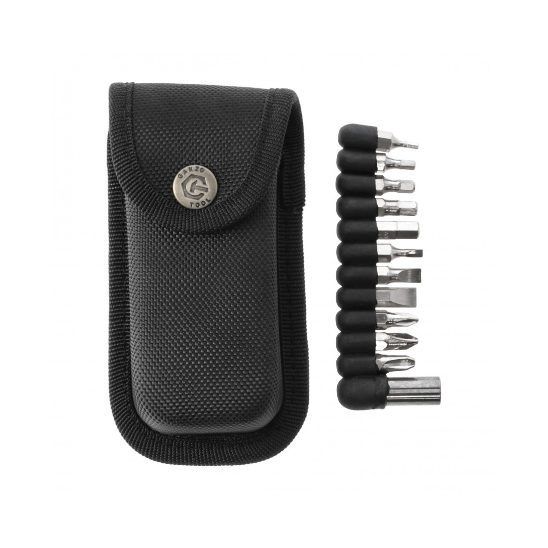 Multitool poza zintegrowanymi narzędziami ma także zestaw 11 wymiennych bitów montowanych na rozkładanym trzpieniu. Poręczna wielkość (105 mm po złożeniu) oraz ciężar akceptowalny 265 g, sprawiają, że multitool Ganzo G202 może nam towarzyszyć podczas codziennej aktywności. Do wygodnego przenoszenia multitoola i bitów na pasie otrzymujemy nylonowy pokrowiec zapinany na napę.