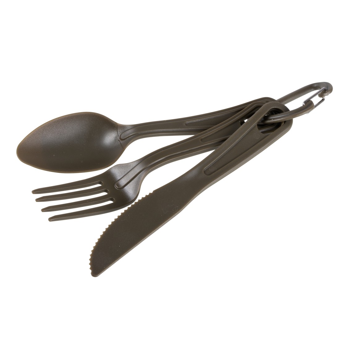 Zestaw składa się z łyżki, ząbkowanego noża i widelca wykonanych w całości z poliwęglanowego tworzywa Lexan. Lity poliwęglan cechuje się dużą wytrzymałością na uszkodzenia mechaniczne, a także wysoką odpornością na warunki atmosferyczne i nagłe zmiany temperatur. Dzięki zastosowaniu tworzywa Lexan sztućce są niezwykle lekkie, odporne na życie i korozję oraz łatwe do czyszczenia. Wszystkie elementy niezbędnika Lexan Mil-Tec można spiąć za pomocą aluminiowego karabińczyka.