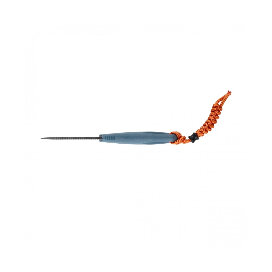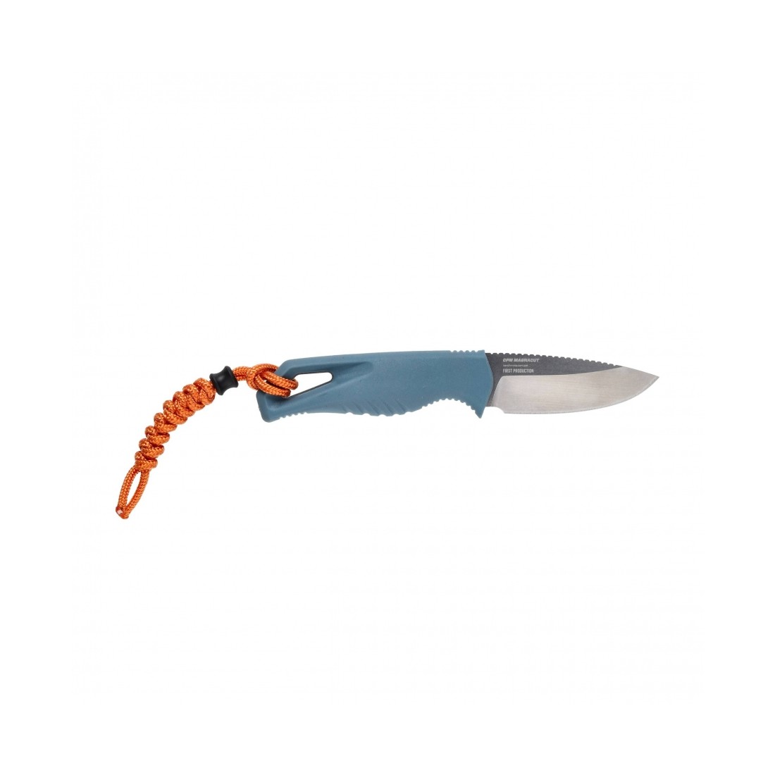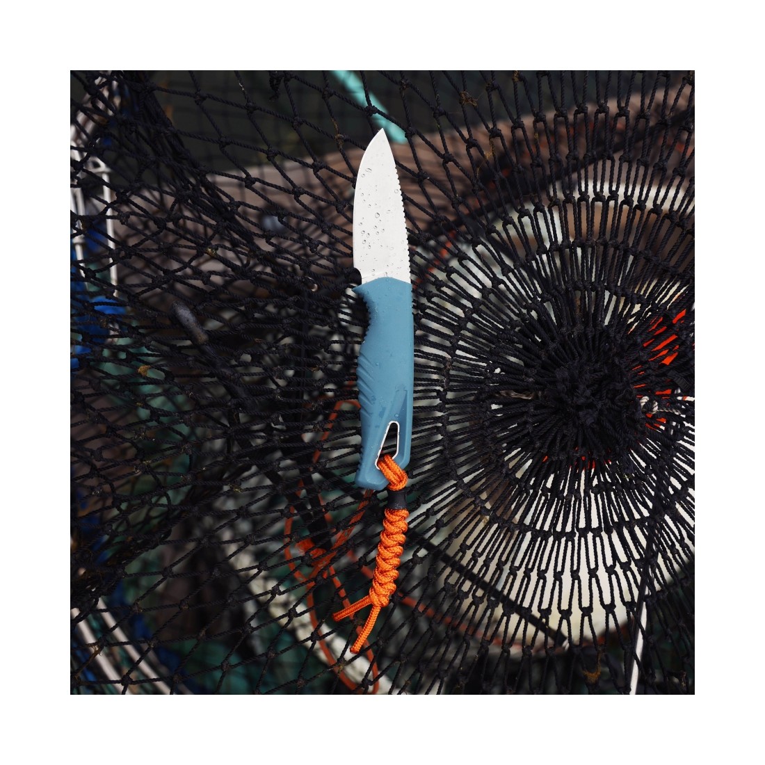 Nóż otrzymał rękojeść z tworzywa Santoprene®, przypominającego w dotyku gumę. Materiał ten jest antypoślizgowy, higieniczny i całkowicie odporny na działanie wody. Dzięki temu nóż pozostaje stabilny w dłoni nawet podczas pracy mokrymi czy zabrudzonymi rękami. Na końcu rękojeści znajduje się otwór na linkę lub paracord, co pozwala zabezpieczyć narzędzie przed zgubieniem, np. podczas wyprawy na jacht czy łódkę.