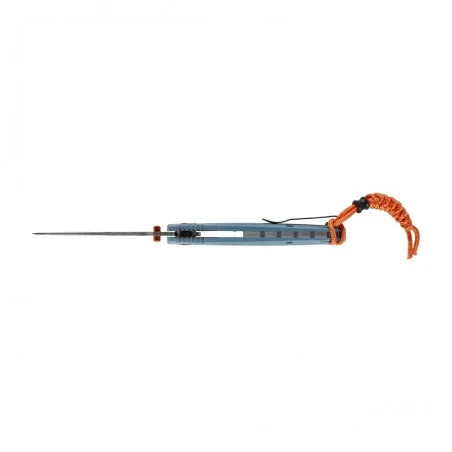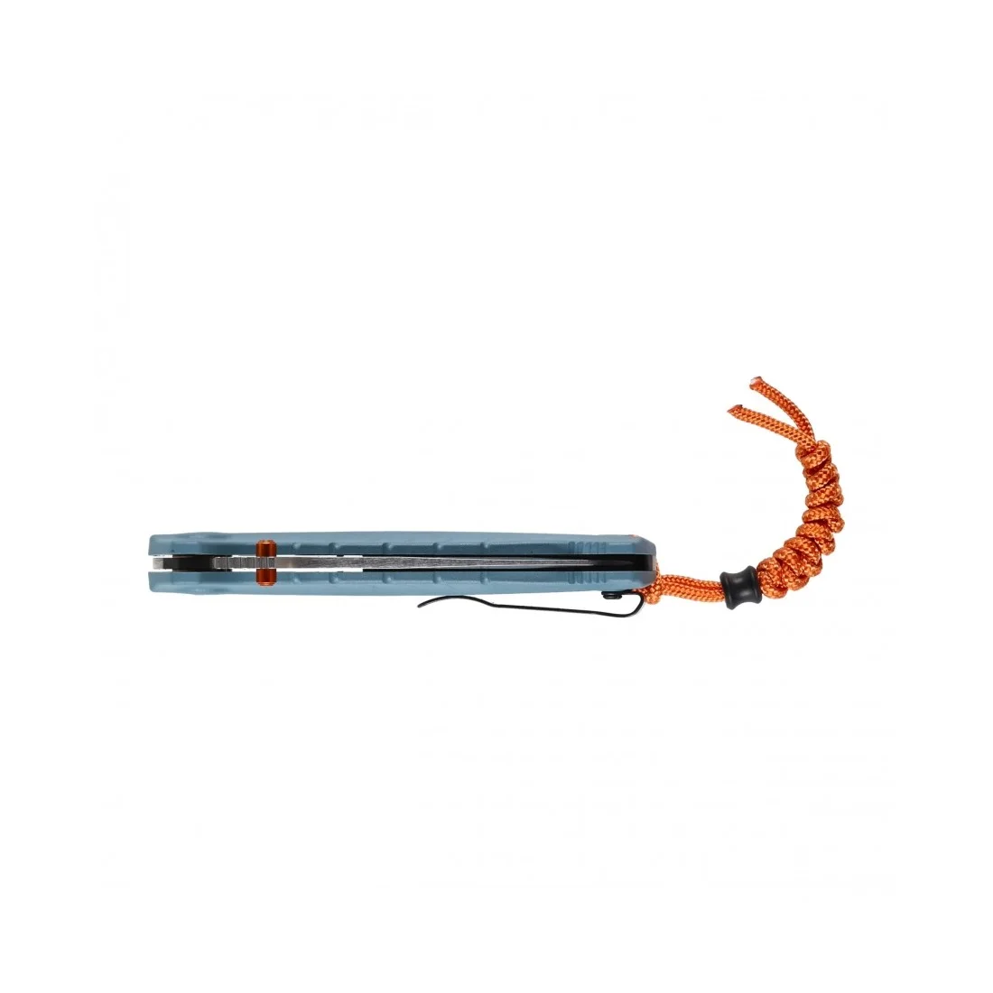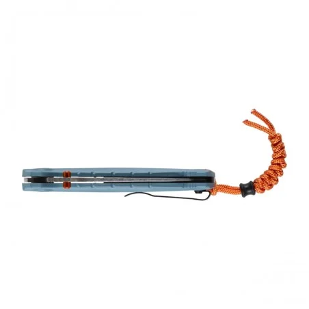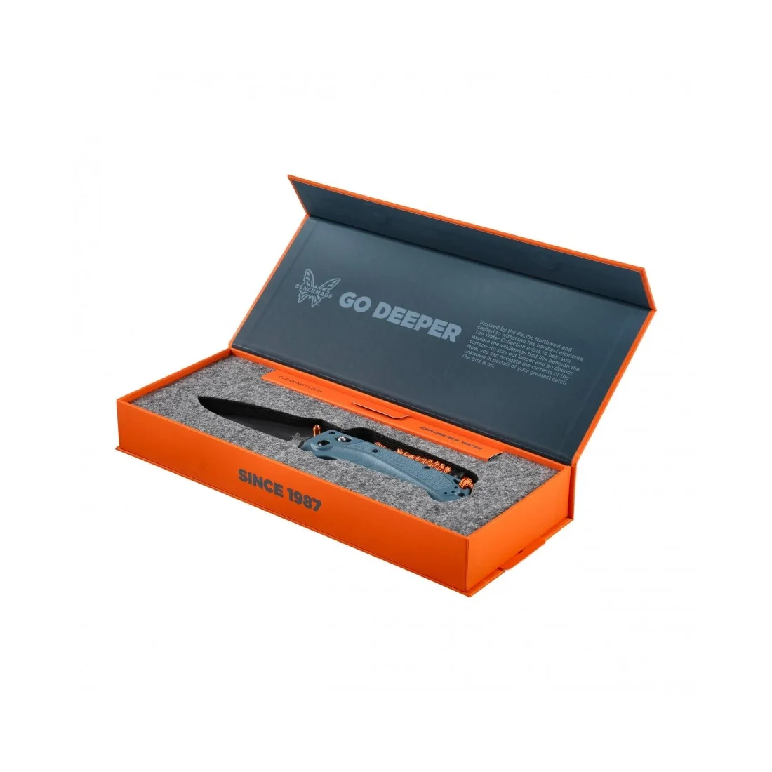 Klingę można w wygodny sposób rozłożyć jedną ręką przy użyciu obustronnego kołka w kolorze pomarańczowym, dzięki czemu po wyjęciu z kieszeni nóż jest błyskawiczne gotowy do pracy. Okładziny w nożu składanym Benchmade Adira powstały z tworzywa Grivory w kolorze głębokiego błękitu. Profilowane okładziny o antypoślizgowym teksturowaniu, zapewniają pewny chwyt noża również mokrą lub zabrudzoną dłonią, co jest niezwykle istotne w przypadku użytkowania foldera w środowisku wodnym.