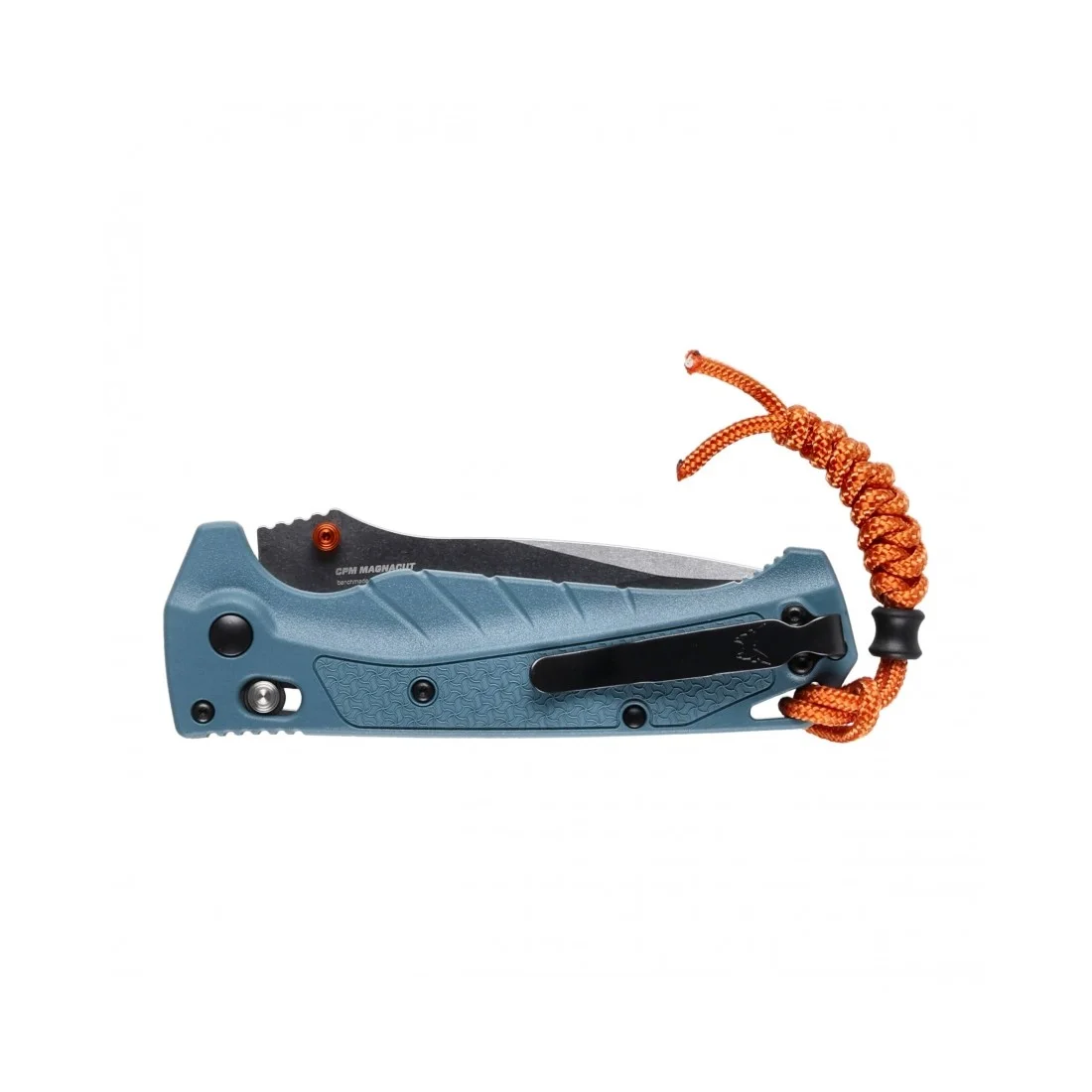 Klips z opcją przełożenia (lewa/prawa), umożliwia wygodne przenoszenie noża w kieszeni spodni. W rękojeści znajduje się również otwór umożliwiający mocowanie linki lub oplotu z paracordu. Razem z folderem Benchmade użytkownik otrzymuje temblak z paracordu w kolorze pomarańczowym.