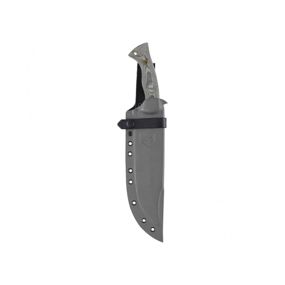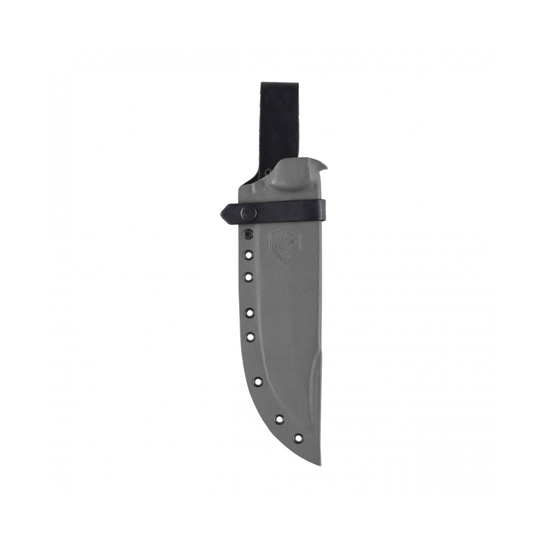 Do noża dołączono obustronną kydexową pochwę. Wyposażono ją w skórzaną szlufkę, pozwalającą przenosić narzędzie przy pasie.
