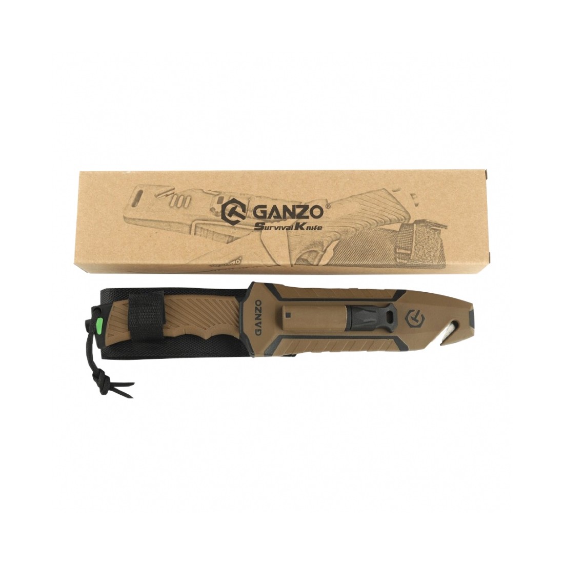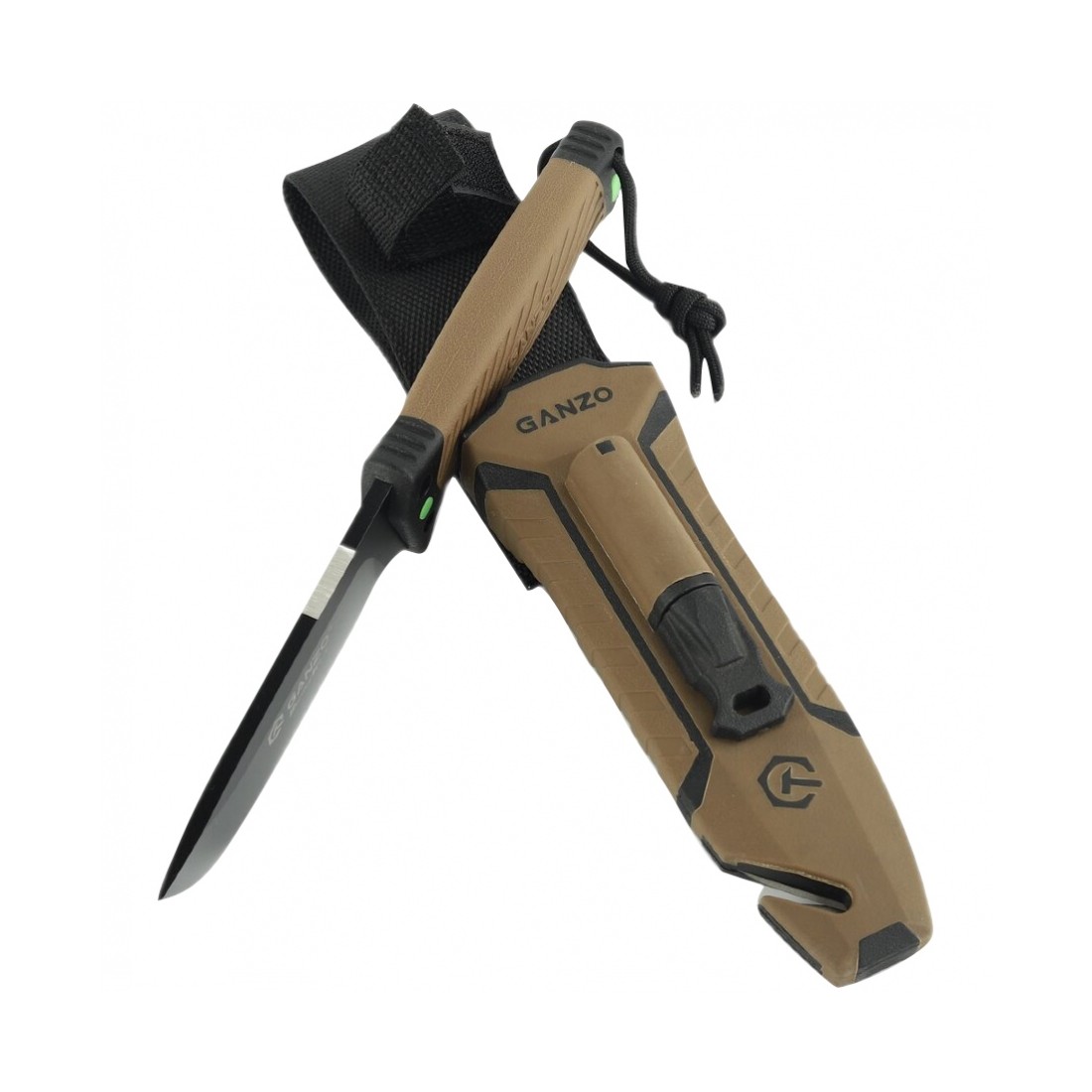 Do noża Ganzo Firebird G8012V2-DY dołączono wielofunkcyjną pochewkę, która nie tylko na bezpieczne przenoszenia noża, ale ma również szereg ważnych narzędzi survivalowych. Pochewkę wykonano z tworzywa sztucznego oraz tkaniny nylonowej, odpornej na wilgoć, pleśń i upływa czasu. Na zewnętrznej stronie umieszczono kompaktowe krzesiwo, za pomocą którego, już po krótkim treningu bez trudu rozpalimy ogień. Na wewnętrznej stronie zamontowano małą ostrzałkę diamentową pozwalającą na ostrzenie noża w terenie. W dolnej części pochewki osadzono wyjmowane ostrze, które z łatwością radzi sobie z cięciem linki, żyłki oraz taśmy.