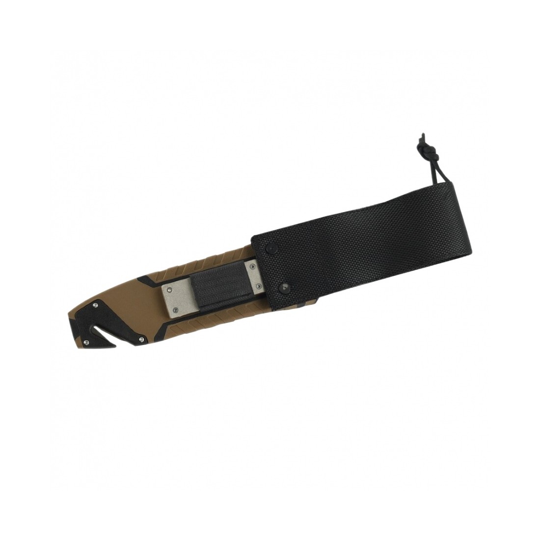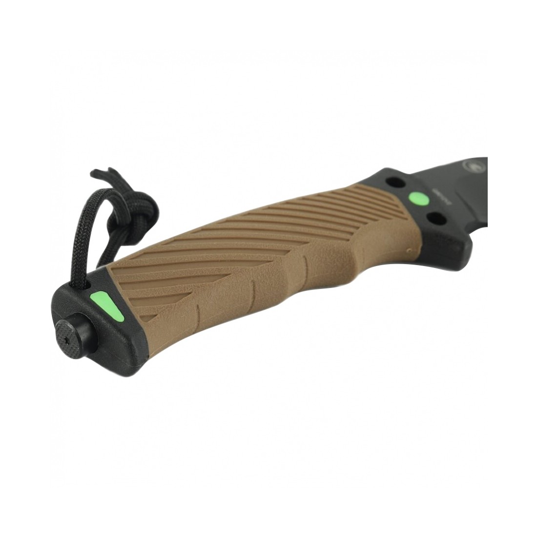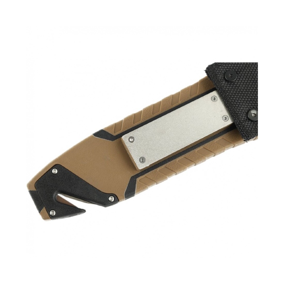Długą krawędź tnąca sprawia, że praca tym nożem to czysta przyjemność. Elementem, który wyróżnia nóż, jest jego modułowa konstrukcja, dzięki czemu po odkręceniu stalowego trzpienia (w tylnej części chwytu) możemy wysunąć głownię z rękojeści i wykorzystać ją np. do wytworzenia improwizowanej włóczni. Nakrętka blokująca klingę pełni także funkcję pobijaka oraz zbijaka do szyb wykorzystywanego podczas akcji ratowniczej. Profilowana rękojeść z polimeru ma wycięcia na palce oraz skośne żebrowanie, poprawiające chwyt noża. Otwór w rękojeści wykorzystano do wplecenia linki paracord, którą oczywiście można zastąpić innym dodatkiem. Na rękojeści umieszczono wstawki o zwiększonej widoczności, które pomagają w zlokalizowaniu zagubionego noża.