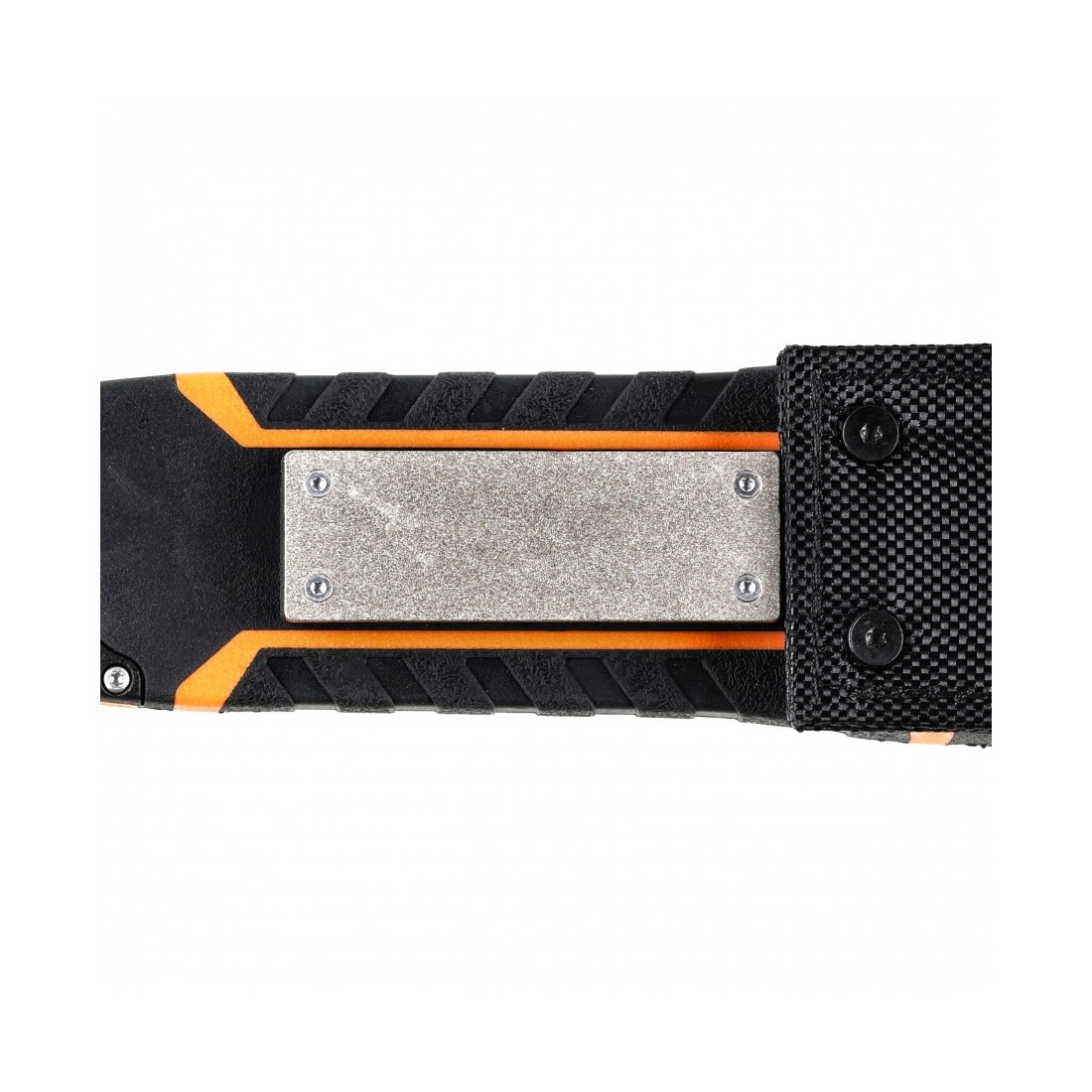 - Ostrzałka diamentowa – wbudowana na wewnętrznej stronie pochewki, pozwala na podostrzenie noża w terenie.