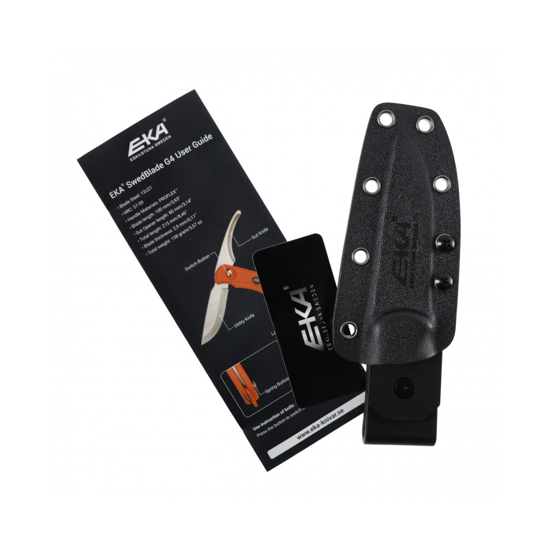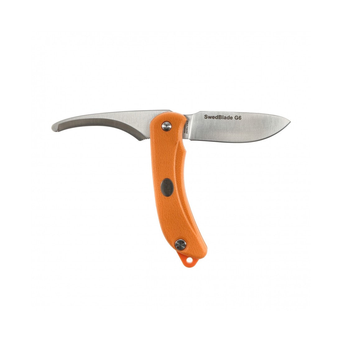 EKA SwedBlade G6 to nowoczesny nóż myśliwski z dwoma obrotowymi ostrzami – do skórowania (Drop Point) oraz patroszenia. Wykonany z wytrzymałej stali Sandvik 12C27 (HRC 57–59), gwarantuje długotrwałą ostrość i pewne działanie w terenie. Intensywny pomarańczowy kolor zwiększa widoczność podczas polowania.