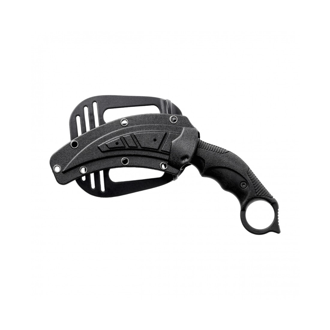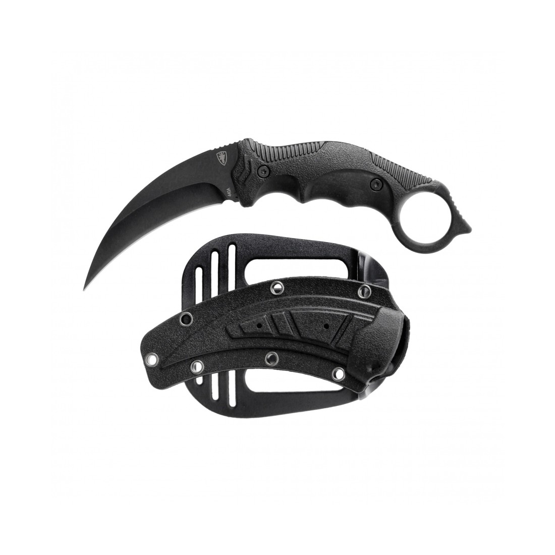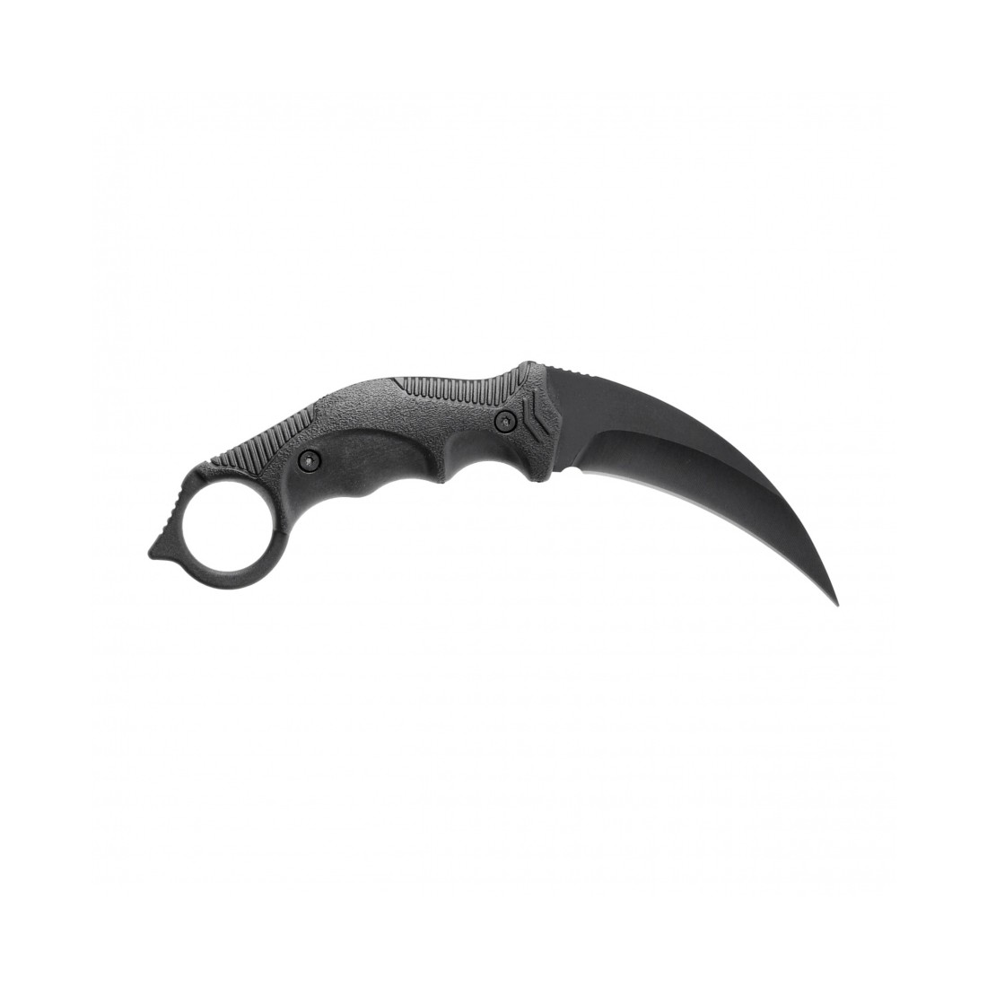 Na grzbiecie klingi umieszczono frezowane oparcie pod kciuk, które poprawia kontrolę i bezpieczeństwo pracy przy precyzyjnym cięciu. Rękojeść z profilowanymi okładzinami z laminatu G10 gwarantuje pewny chwyt nawet w trudnych warunkach. Charakterystyczny pierścień na końcu rękojeści umożliwia szybką zmianę chwytu, co jest typowe dla noży karambit. Do wygodnego przenoszenia służy lekka pochewka z polimeru wyposażona w płetwę montażową do pasa.