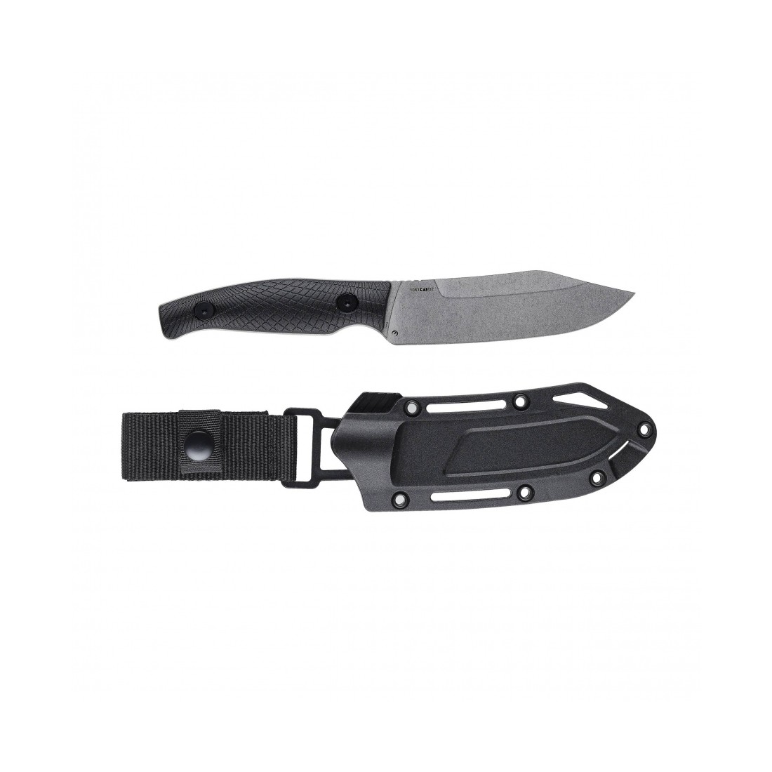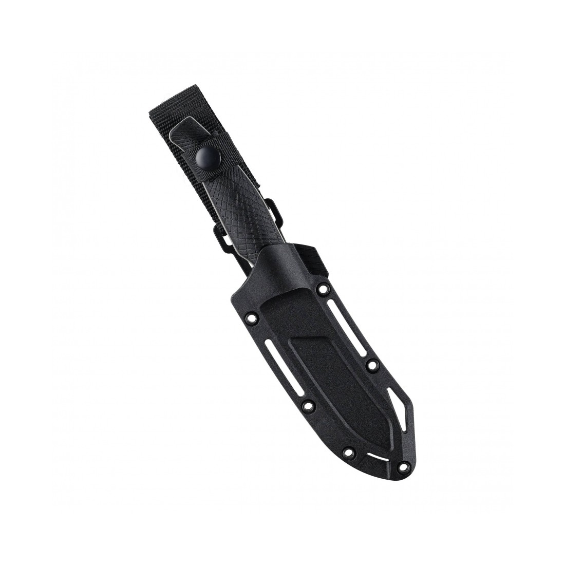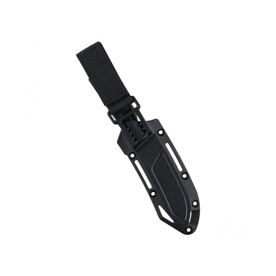W zestawie znajduje się wytrzymała pochewka z polimeru, wytwarzana metodą wtryskową. Można ją nosić przy pasie lub zamocować do oporządzenia. Metalowa nap chroni nóż przed przypadkowym wysunięciem.