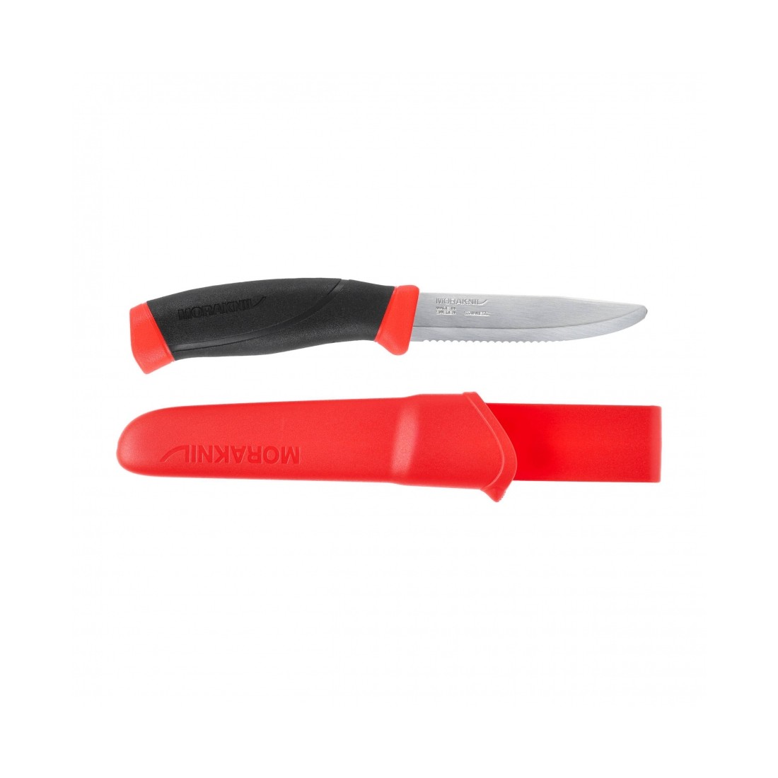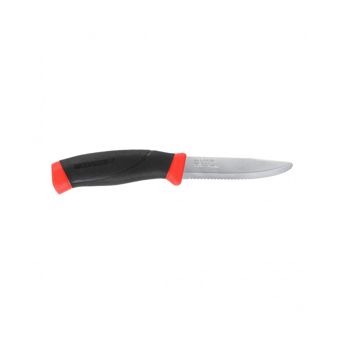 Mora Companion F Rescue to nóż ratowniczy, umożliwiający niesienie pomocy m.in. ofiarom wypadków lokomocyjnych. Klinga o ząbkowanej krawędzi tnącej, długiej na 99 mm, skutecznie poradzi sobie z cięciem pasów czy też ubrań. Wykuto ją ze stali nierdzewnej Sandvick 12C27, odpornej na korozję i łatwej w ostrzeniu. Zaokrąglony sztych noża zmniejszona ryzyko przypadkowego skaleczenia ratowanej osoby.