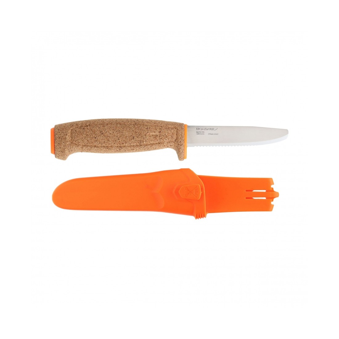 Największym wyróżnikiem noża jest korkowa rękojeść o podwyższonej widoczności, dzięki której nóż unosi się na powierzchni wody. Korkowa struktura zapewnia lekkość, dobrą przyczepność oraz komfortowy chwyt nawet mokrą dłonią. Niska masa noża sprawia, że jest on wygodny w codziennym użytkowaniu podczas aktywności wodnych.